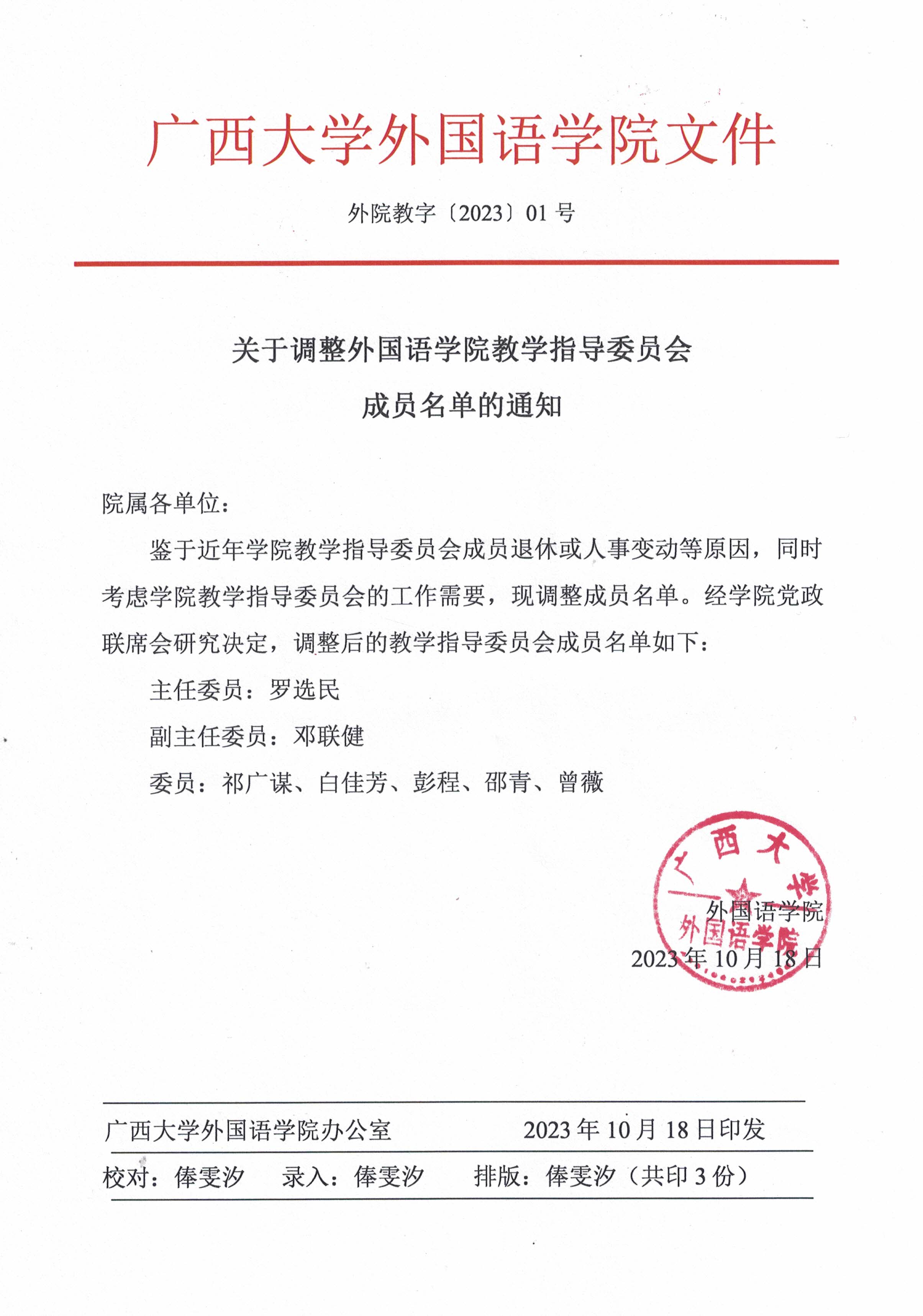 【本教文件】关于调整ok138太阳集团古天乐教学指导委员会成员名单的通知