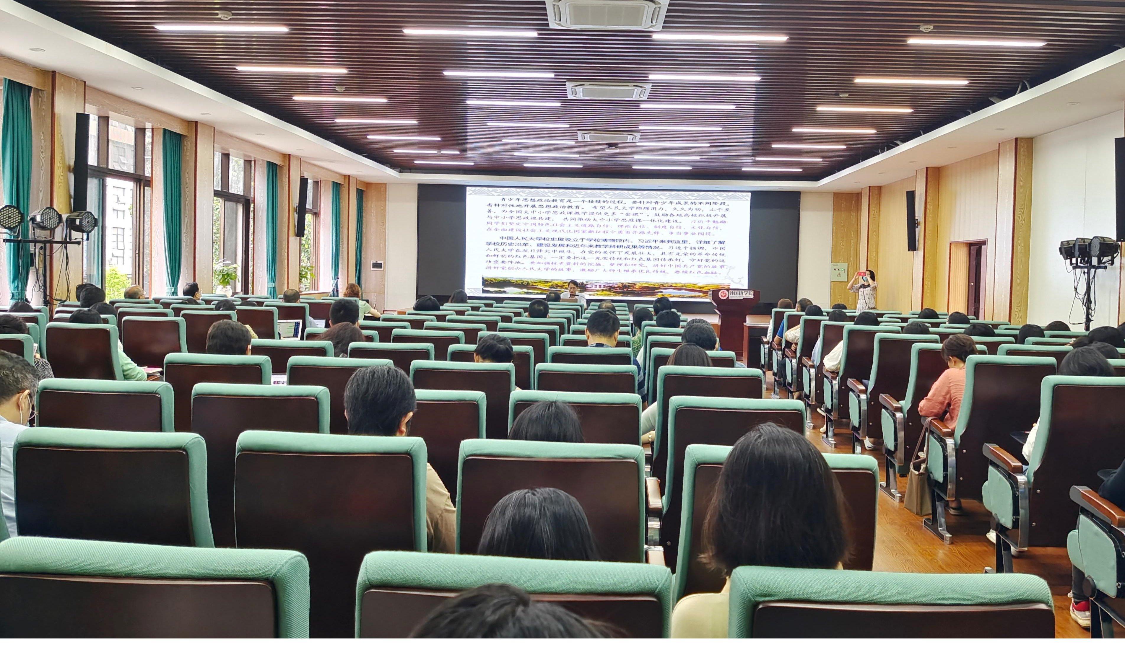 黄书记先是对习近平总书记考察中国人民大学的基本概况做了详细介绍并带领老师们深入学习了习近平总书记在中国人民大学发表重要讲话的核心内容,随后对庆祝中国共产主义青年团成立100周年大会的基本概况做了详细说明,深入解读了习近平总书记给共青团、共青团员以及团干部提出的要求,最后对全院师生提出了殷切期望,希望同学们争做堪当民族复兴重任的时代新人,在实现中华民族伟大复兴的时代洪流中踔厉奋发、勇毅前进;希望老师们努力成为被社会尊重的楷模,努力成为世人效法的榜样,尽心尽力培养德智体美劳全面发展的社会主义建设者和接班人!