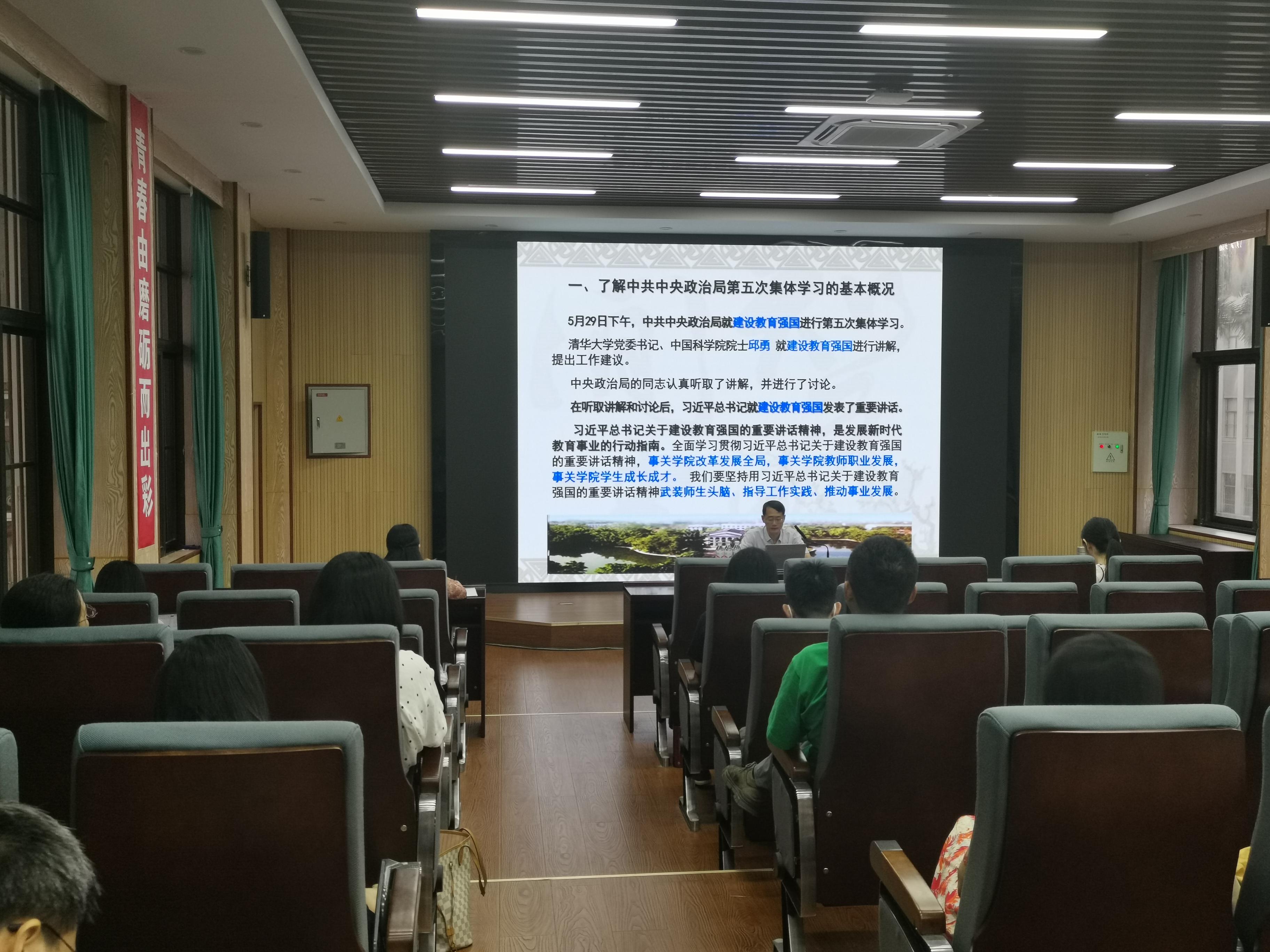 黄开勇书记主讲党课题为《全面深入学习贯彻习近平总书记在中共中央政治局第五次集体学习时的重要讲话精神》 ,主要内容有:了解中共中央政治局第五次集体学习的基本概况、精准把握习近平总书记重要讲话精神的核心要义、学习贯彻习近平总书记重要讲话精神的主要安排。黄书记强调指出要深入学习习近平总书记重要讲话精神,组织开展多形式、分层次、全覆盖的学习活动,坚持反复学习、争取学深学透准确领会习近平总书记重要讲话精神的核心要义、实践要求,坚持不懈用习近平总书记重要讲话精神武装头脑、指导实践、推动发展。要全面贯彻习近平总书记重要讲话精神,坚持以学科建设为龙头、以人才培养为中心、以平台建设为支撑、以队伍建设为保障、以改革创新为动力,抓住“一带一路”和“部区合建”发展机遇,坚持团结奋斗、持续奋斗,奋力推进学院创新发展。