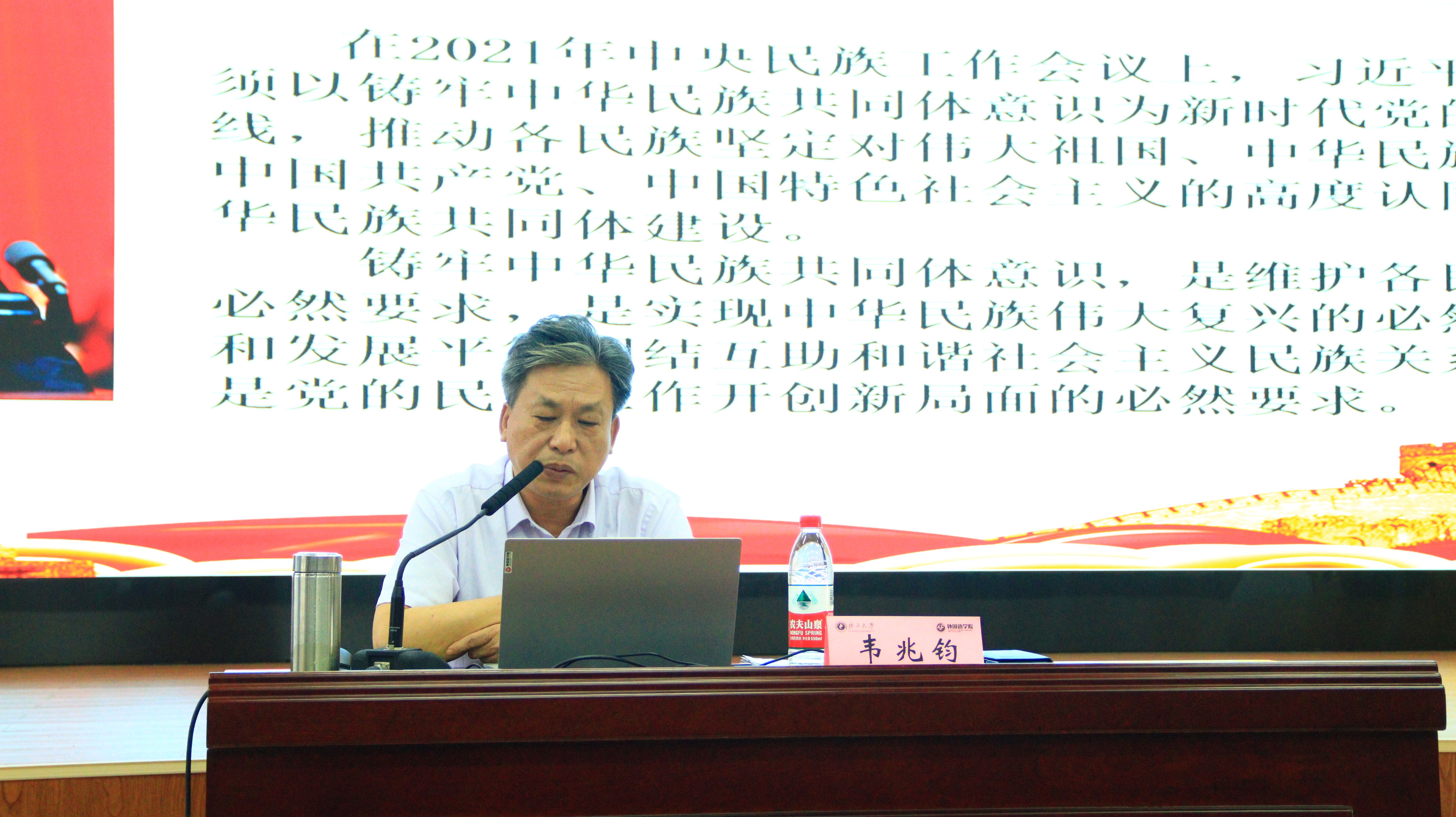 韦教授向老师同学们讲解“中华民族共同体”这一概念提出的历史背景,剖析了“中华民族共同体”的具体内涵;系统的用八个“坚持”和三个“启示”讲解了新时代铸牢中华民族共同体意识的行动指南包括哪些方面;最后从理想信念、不忘初心、牢记使命和提升自身综合能力三个方面论述了如何铸牢中华民族共同体意识。