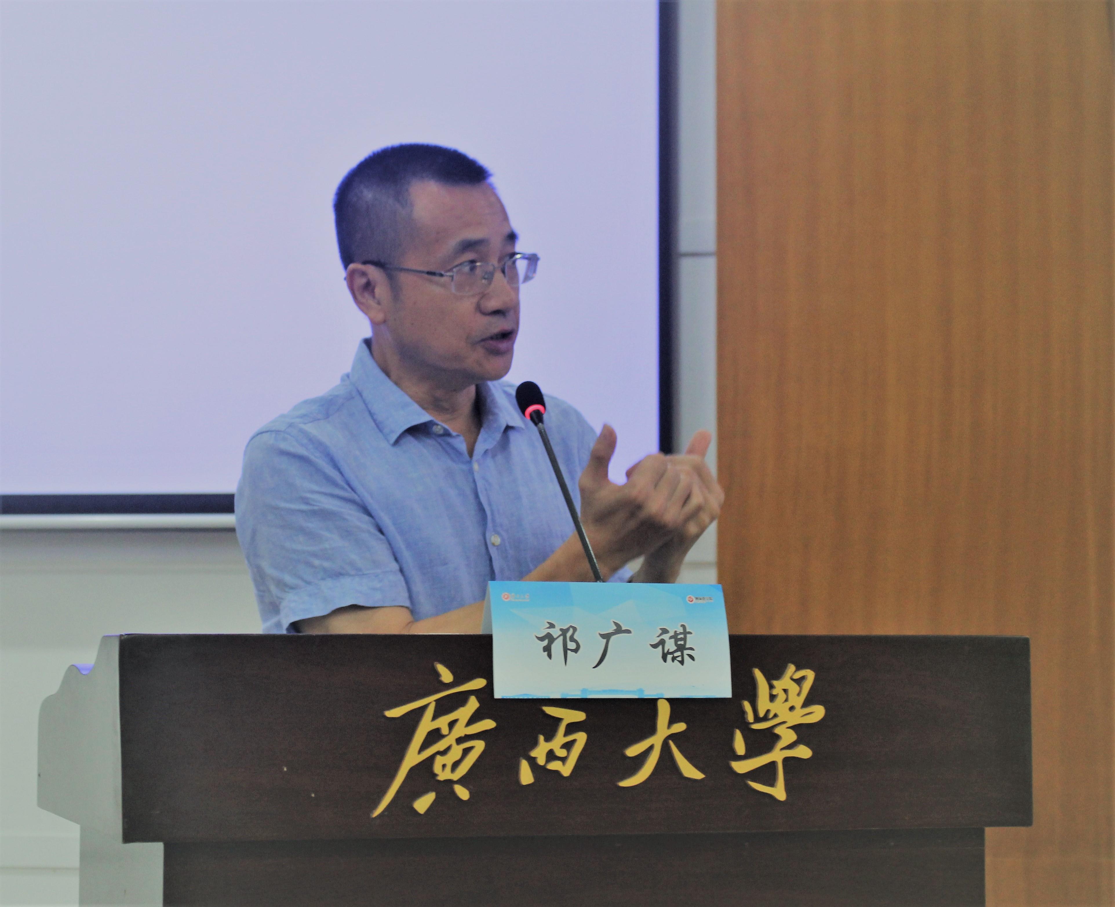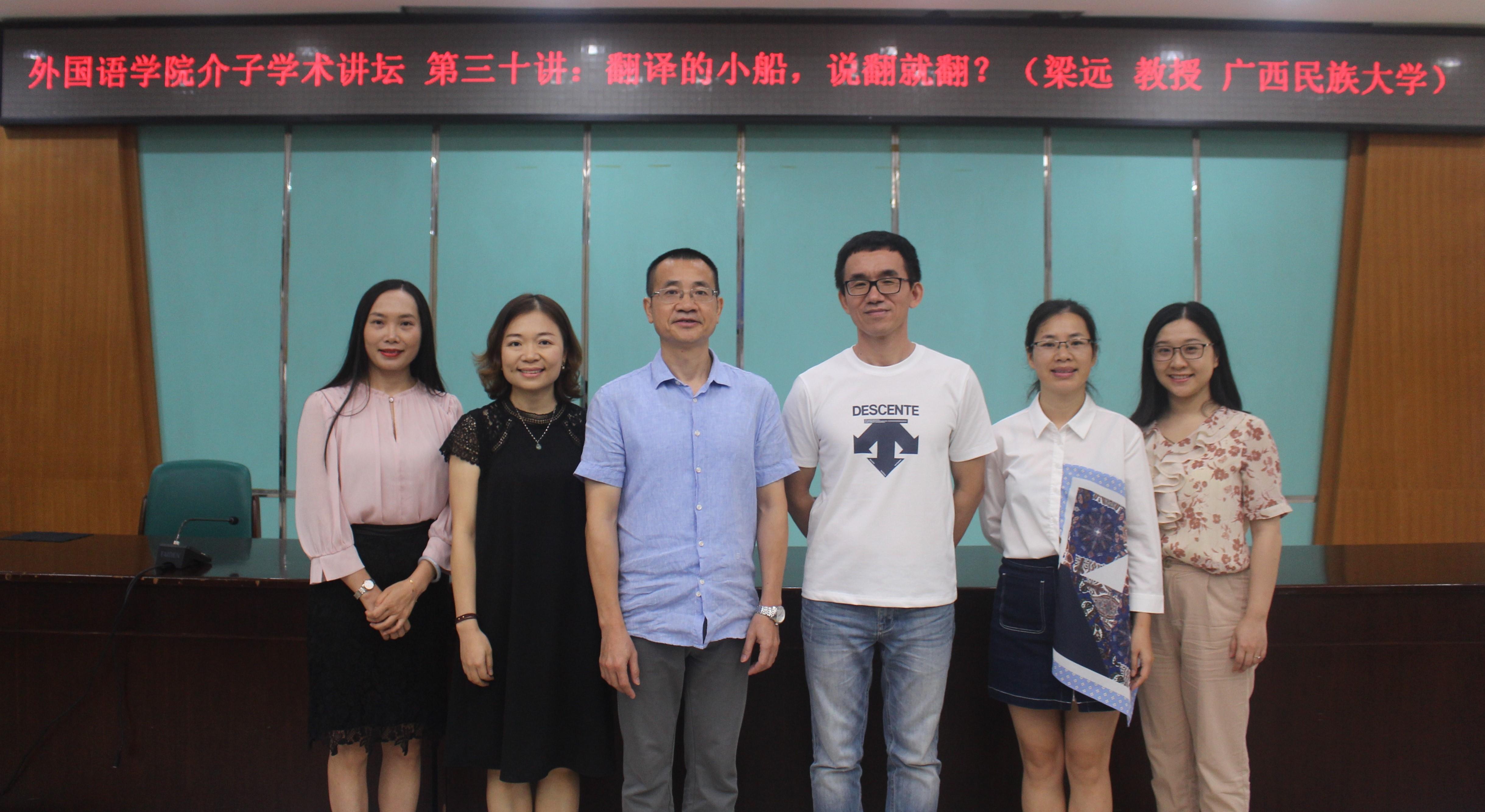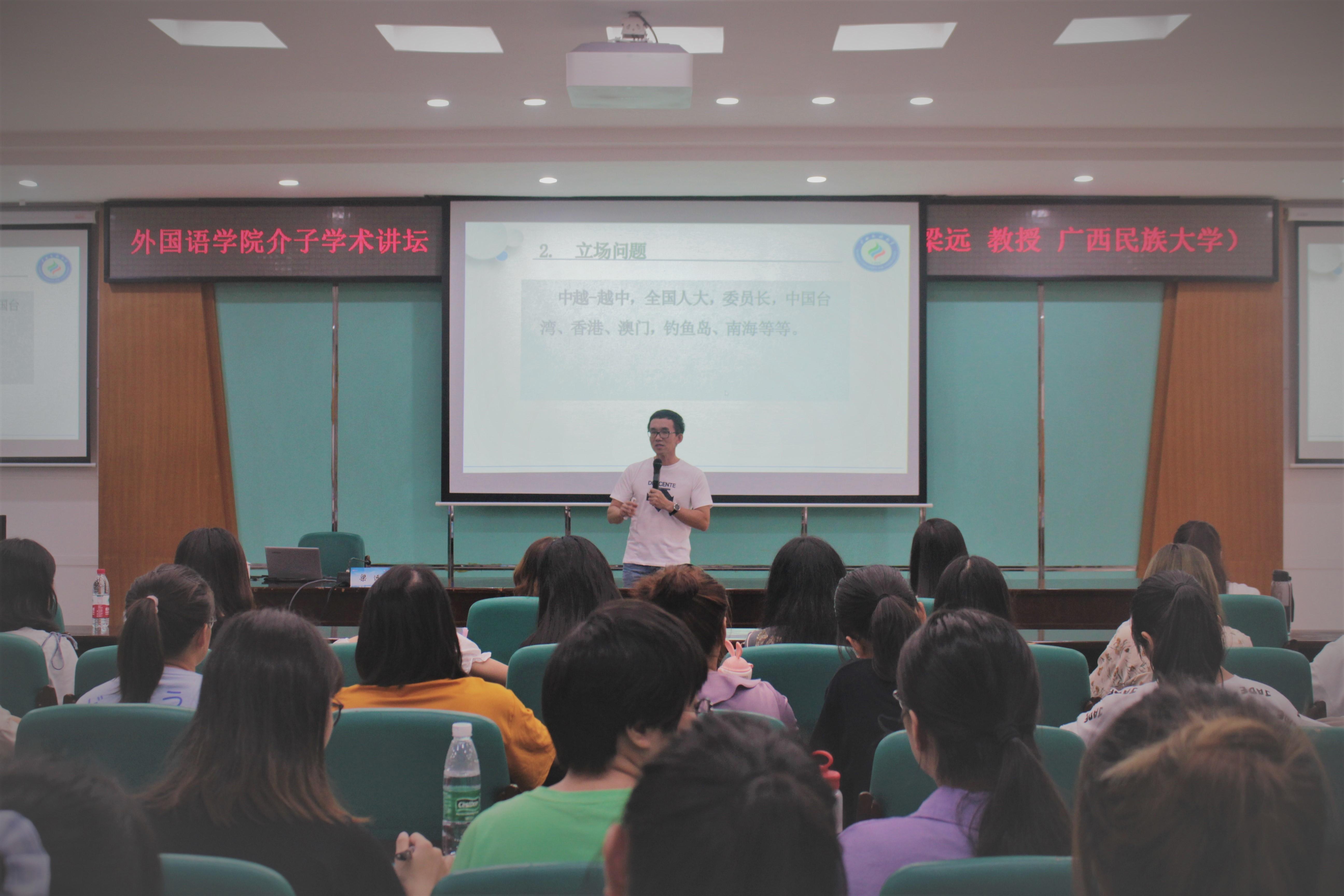 9月22日下午,ok138太阳集团古天乐介子学术讲坛第三十讲在君武楼第二会议室顺利举行。广西民族大学教授、教育部高等学校外语专业教学指导委员会委员、非通用语种类专业教学指导分委员会副主任委员、全国越南语教学研究会会长梁远受邀为越南语专业师生开设题为《翻译的小船,说翻就翻?》的讲座。ok138太阳集团古天乐东南亚语系主任祁广谋教授、东南亚语系副主任卢锦缨老师、硕导秦爱玲老师、韦丽华老师和越南语专业全体学生到场聆听,讲座由祁广谋教授主持。