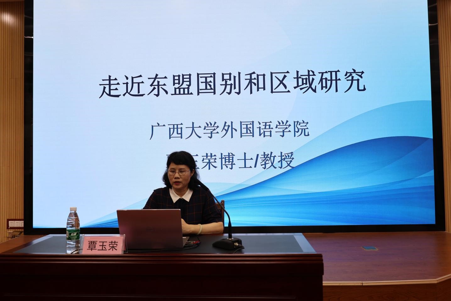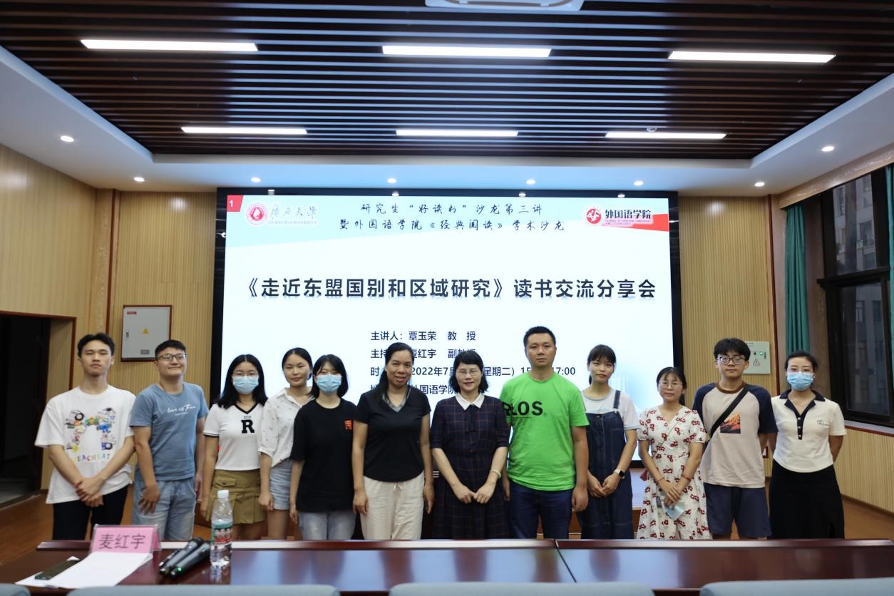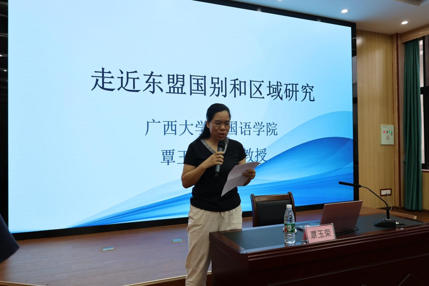 7月5日下午,研究生“好读书”沙龙第三讲暨ok138太阳集团古天乐“经典阅读”学术沙龙之“走近东盟国别和区域研究”读书交流分享会于ok138太阳集团古天乐融通厅顺利举行。此次读书分享会由硕士生导师覃玉荣教授主讲,麦红宇老师主持,学院众多师生到场交流学习。