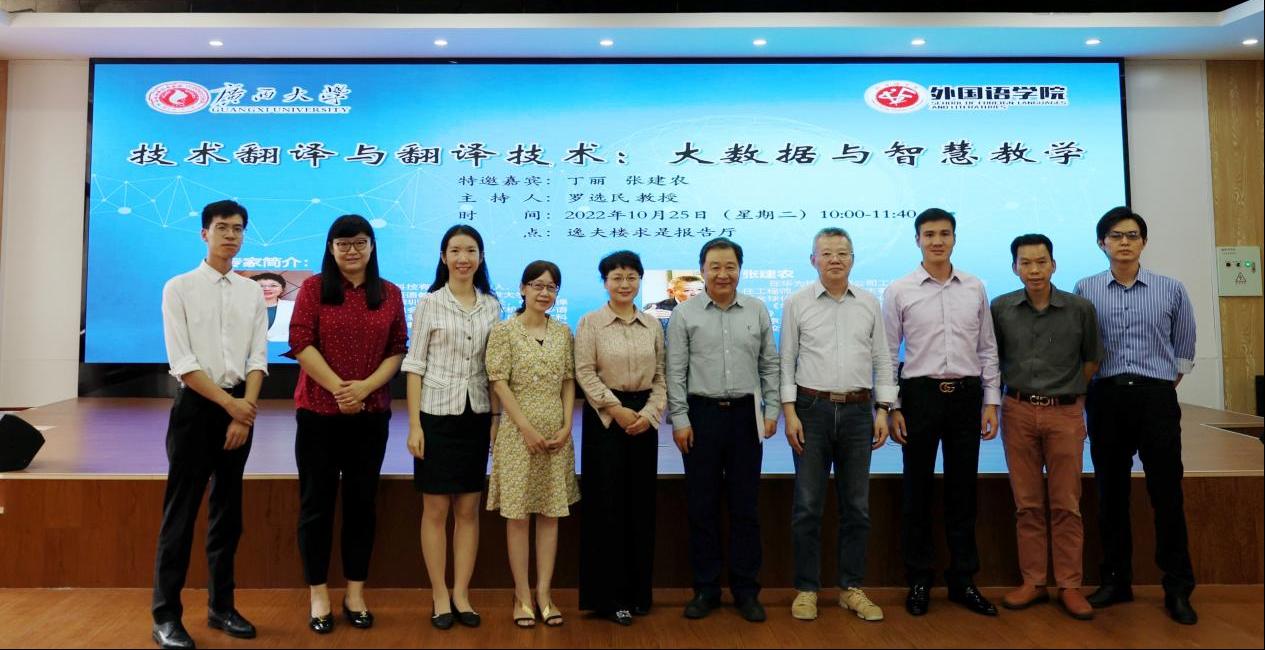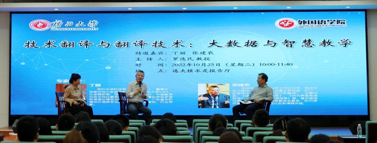 2022-2023学年第一学期,ok138太阳集团古天乐深化产教融合,加强协同育人,积极开展院企合授课程活动。10月25日上午,罗选民院长主讲的本科课程《翻译概论》邀请了两位企业行家进课堂,开启了本学期院企协同育人第一课。为让更多学生受益,定题为“技术翻译与翻译技术:大数据与智慧教学”的这一讲课堂延伸至学院“求是”报告厅举行,吸引了我院本、硕学生和专任教师的积极参与。