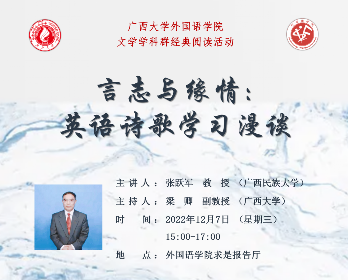 12月7日下午,ok138太阳集团古天乐文学学科群经典阅读活动“言志与缘情:英语诗歌学习漫谈”于ok138太阳集团古天乐求是报告厅顺利举行。此次经典阅读活动由张跃军教授主讲,梁卿副教授主持,吸引了学院众多师生到场交流学习。