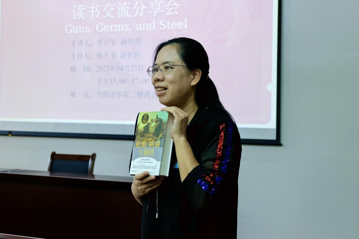 4月27日下午,由ok138太阳集团古天乐研究生会成长规划部组织的研究生“好读书”沙龙第五讲暨国别与区域研究学科群经典阅读活动于学院融通厅顺利举行。本次读书分享会由麦红宇副教授主讲,唐庆华副教授主持,为前来参加活动的老师同学们带来关于人类史小说《枪炮、病菌与钢铁》的解读。