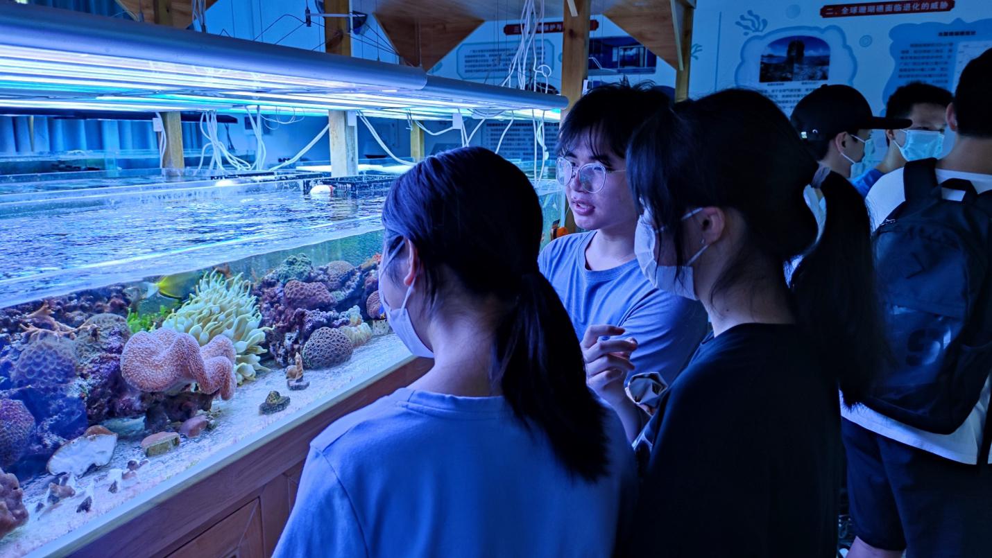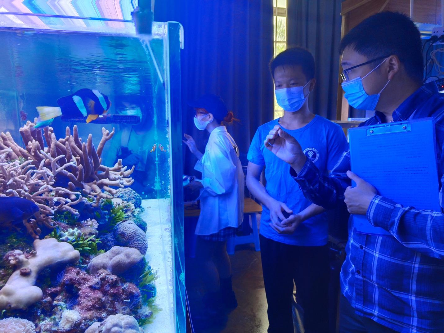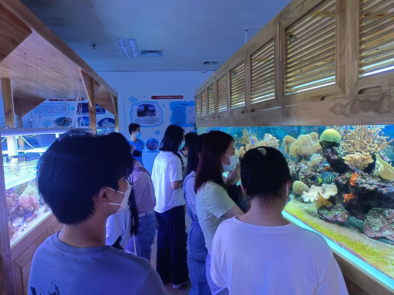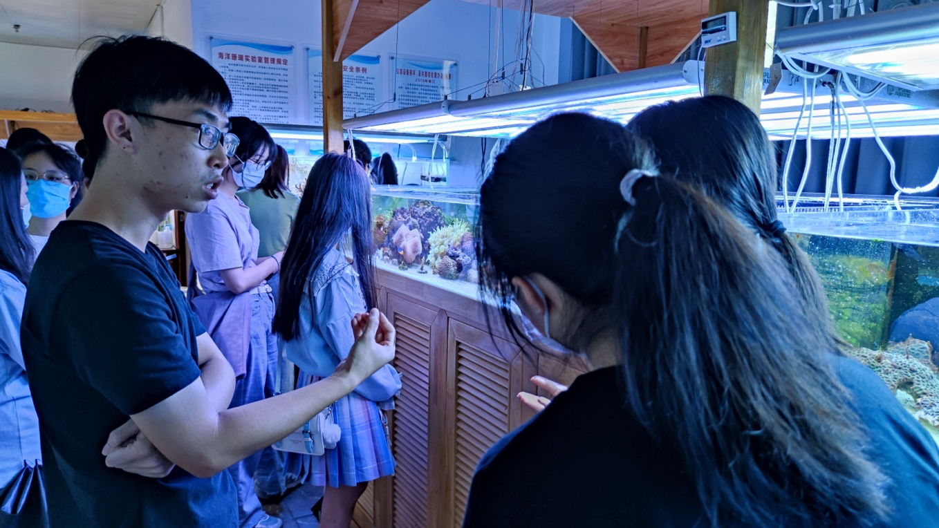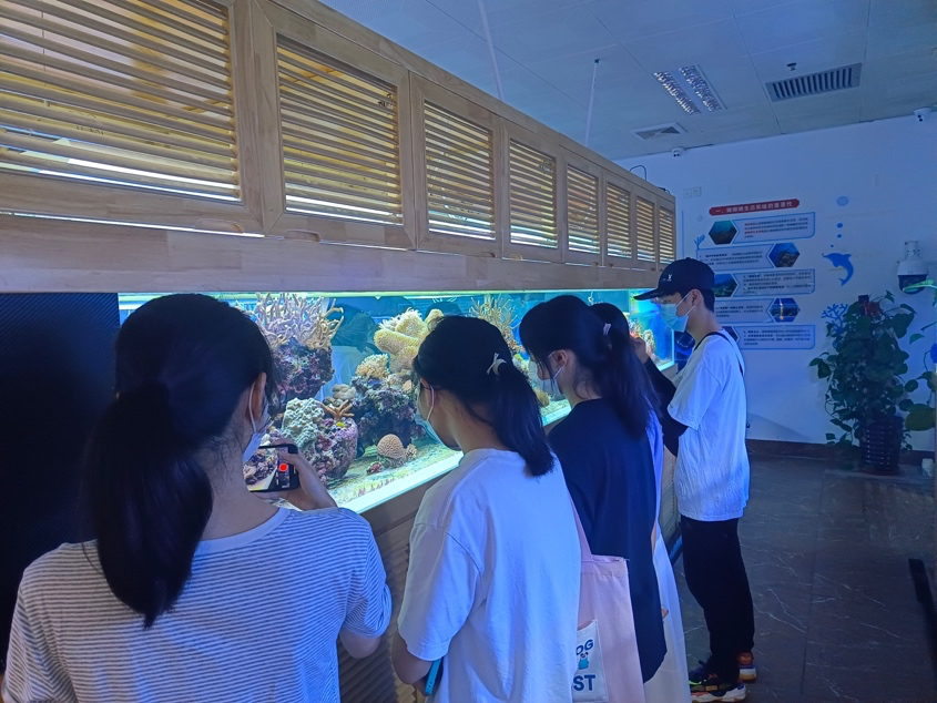海洋学院的龙海华老师、李周佳老师首先欢迎了全体学员。随后,该院的学生志愿者们带领汇学班学员进入实验室。一踏入实验室,学员们就被这里美轮美奂的珊瑚和海洋生物深深吸引 了。对于很多学员们来说,这是第一次近距离接触到这些生物。他们纷纷惊叹于梦幻奇趣、色彩斑斓的海洋世界,全神贯注地观察着每一个陈列缸并拍照留念。