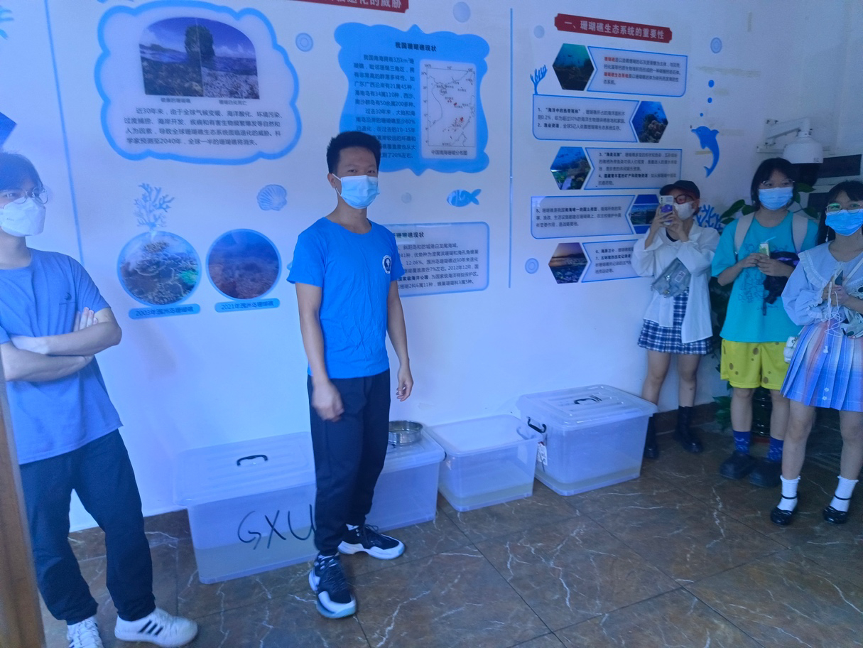 在充分欣赏了五彩缤纷的海洋世界后,志愿者们将学员们的眼光引向了一个灰白基调、毫无生气的陈列缸。志愿者介绍道,这里存放的是白化的珊瑚尸骨。目前,世界各地的珊瑚礁正遭到严重破坏,而人类应对此担负主要责任。沿海地区的重工业作为一个持续的污染源给珊瑚礁带来沉重的压力,而过度捕捞造成的船舶漏油、重型拖网齿轮撞击等问题威胁着珊瑚礁的生命。人类废物的排放带来的水体营养成分增加也会导致珊瑚的天敌棘冠海星及竞争者海藻大量繁殖。全球气候变暖导致的海洋平均水温上升也会快速破坏珊瑚礁。而广西南海珊瑚礁研究重点实验室致力于展开科学研究,以更好地服务于海洋生态环境保护。听了志愿者的介绍,学员们纷纷表示,保育珊瑚礁事关重大,刻不容缓。汇学班学员愿以自身的翻译功底和语言特长,协助海洋学院的同学们,向东盟和世界讲述珊瑚礁保育的广西故事、中国故事。