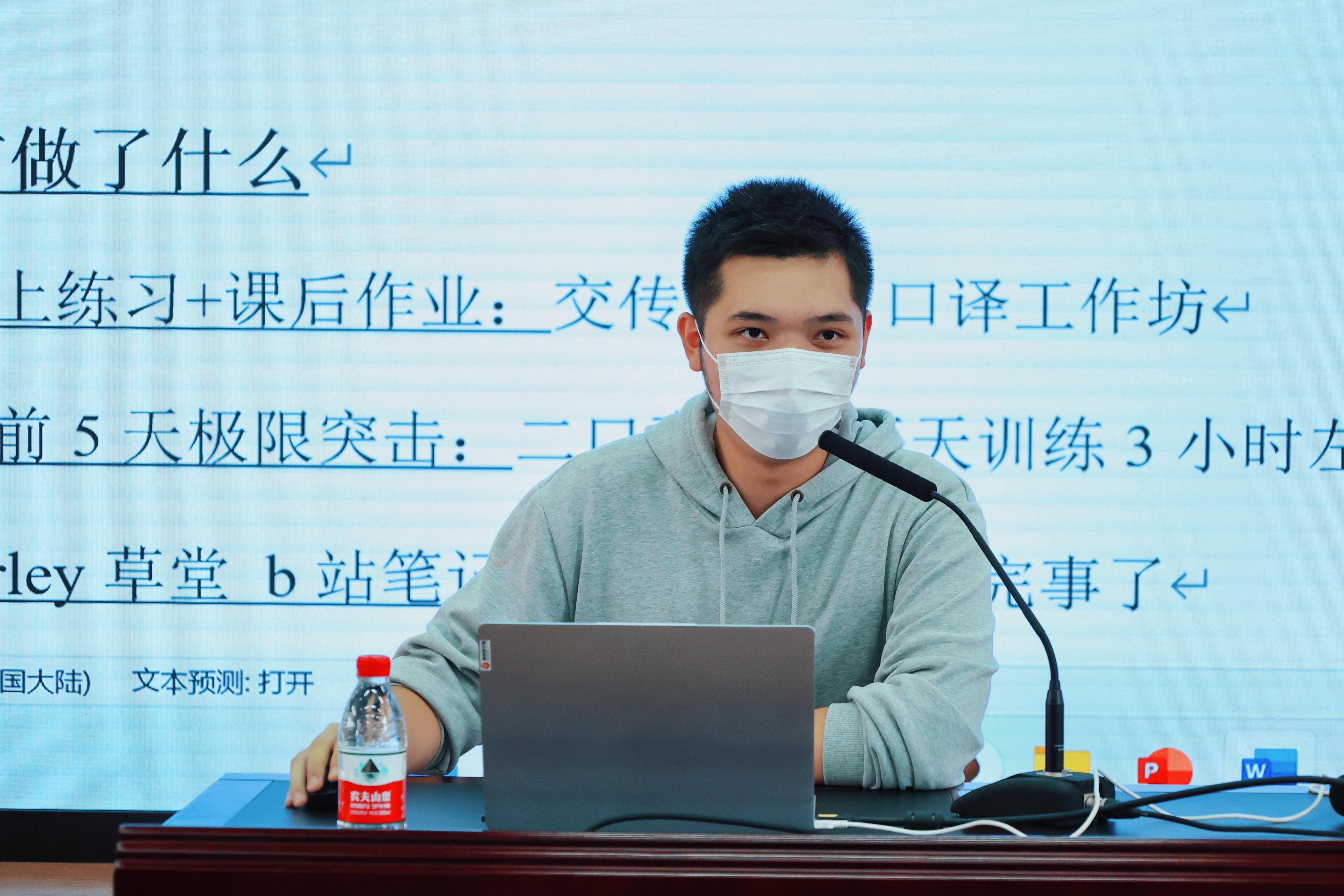 一是考前准备。谢同学建议同学们平时认真完成课后作业,注重交替传译、口译工作坊这两门课的口译训练;在考前使用二级口译的真题进行突击训练,每天训练3小时左右;在B站关注“shirley草堂b站笔记符号”,锻炼记笔记的能力。二是口译入门练习。谢同学认为,听原文时要抓主旨放细节,以理解原文逻辑和大意为主;平时可以关注“播音中国”公众号,通过朗读新闻联播弄清楚中文的表达逻辑,锻炼中文表达能力;利用TED演讲和“speech repository”语料库中的语料练习复述,以提高英文表达能力。最后是日常必备训练。谢同学建议同学们坚持泛听与跟读,每天听外文磨耳朵,根据自己的喜好进行影子跟读,保持语感;听中文时需注意“是什么、为什么、怎么做”,听外文时则要注意每个词是什么,注重内容的细节,要听清楚听明白;做复述时要开口说,录下复述的音频,听自己的存在的问题并及时纠正。