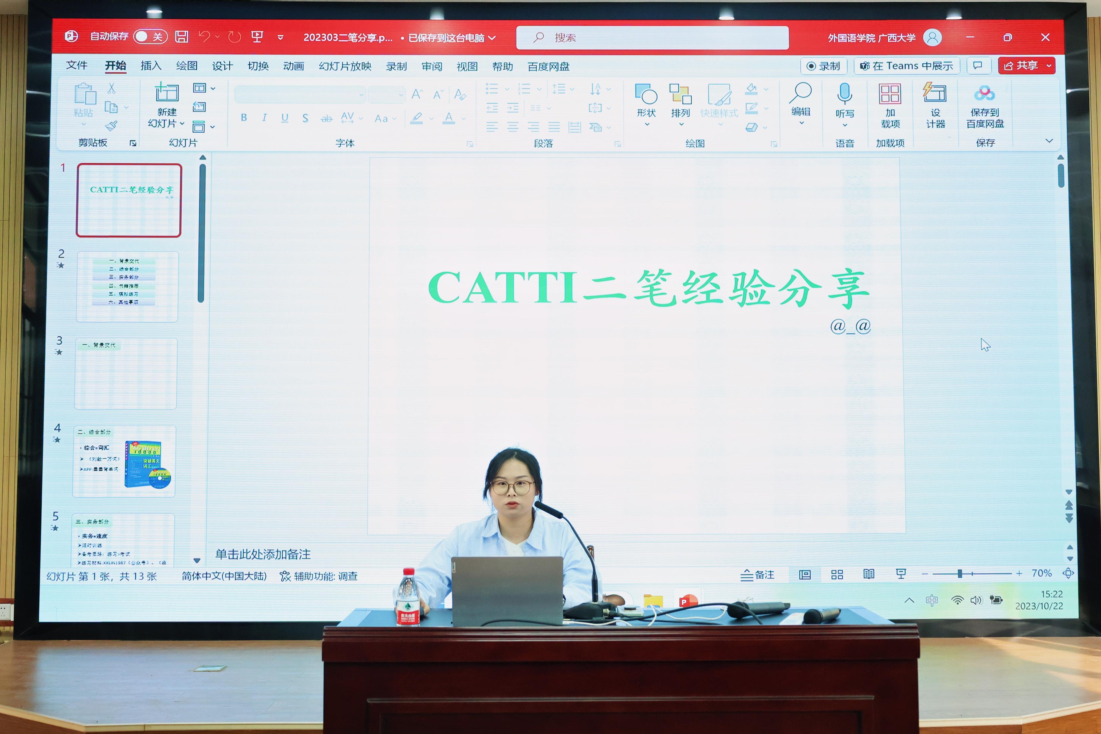 距离全国翻译专业资格水平考试仅剩不到20天,为了帮助同学们提高备考效率,让同学们以更良好的心态迈入考场,10月22日下午,我院研究生会成长规划部在融通报告厅组织CATTI备考经验分享会,邀请22英语口译班的谢镇东同学和汪婷婷同学,以及22英语笔译班的王鹏翔同学作为主讲嘉宾,为前来参加分享会的同学们分享他们的备考经验。其中,谢镇东同学已取得二级笔译和二级口译证书,汪婷婷同学和王鹏翔同学已取得二级笔译证书。