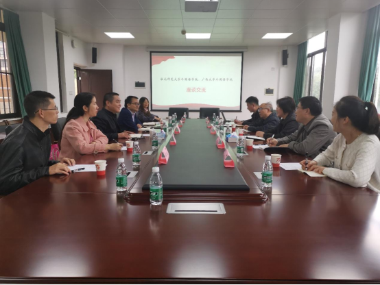 座谈会上,学院党委书记莫柏林对崔凤梅书记一行的到来表示欢迎,并向来访嘉宾介绍了学院的概况。随后,双方就样板党支部的申报与建设、学院“三全育人”工作机制和经验、外语学科发展与人才培养、翻译硕士点建设等方面进行了交流。