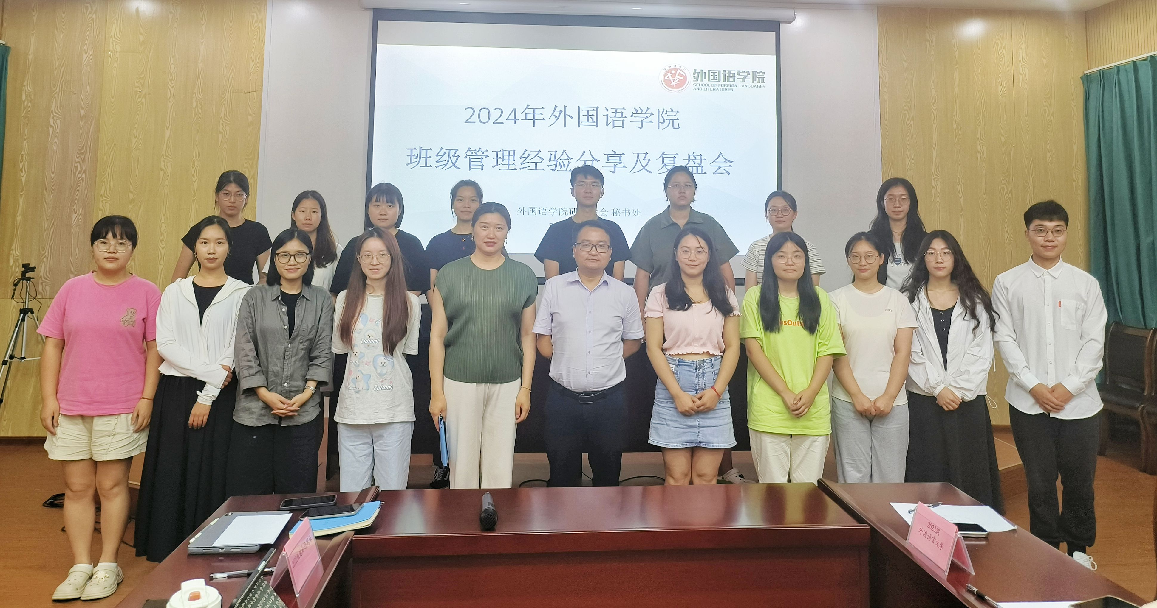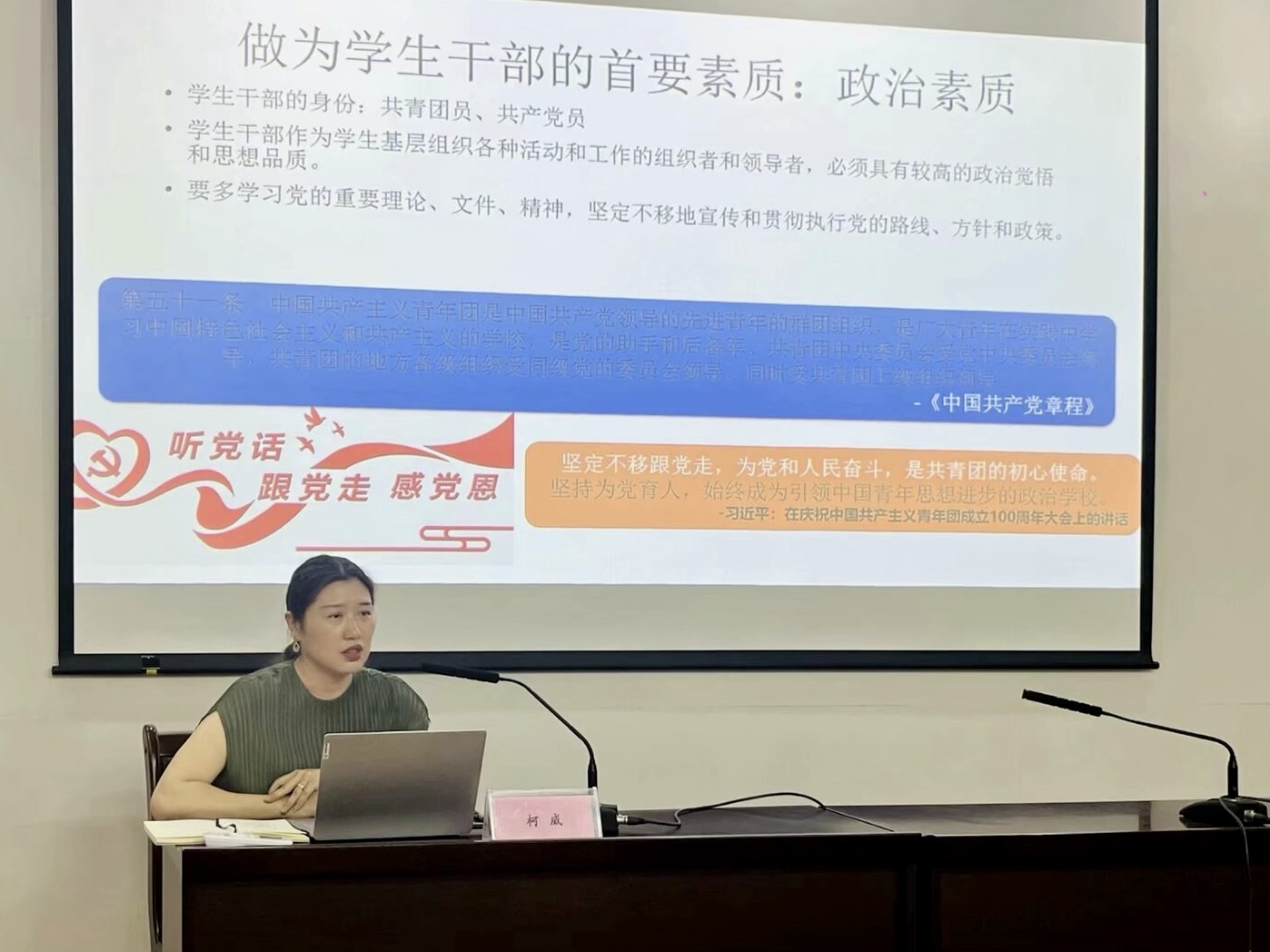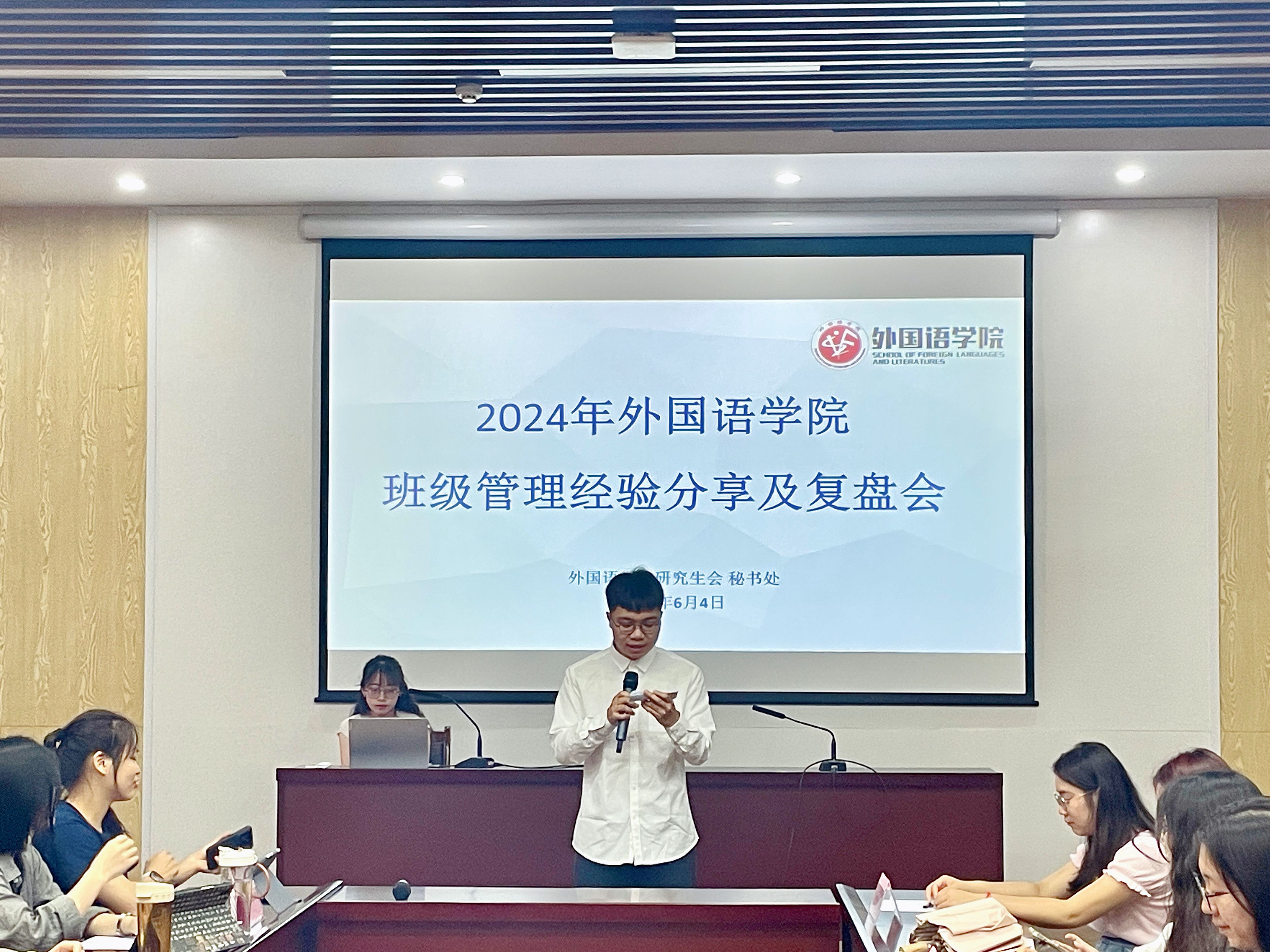 紧接着,活动进入“干货”环节——优秀班级管理经验分享。荣获2023年度“先进班集体”称号的2022级越南语笔译班班长刘滢滢同学分享了她的班级管理经验。刘滢滢结合自身经验,分享了班级管理的几个关键要素:明确班干分工、协同合作、注重班级文化和氛围营造、建立有效的沟通机制以及制定合理的班规。她强调,作为班委,既要有积极向上的蓬勃朝气,也要有心底无私的浩然正气,才能真正成为同学们信赖的服务者。刘滢滢的分享赢得了在场师生的一致认可和热烈掌声。