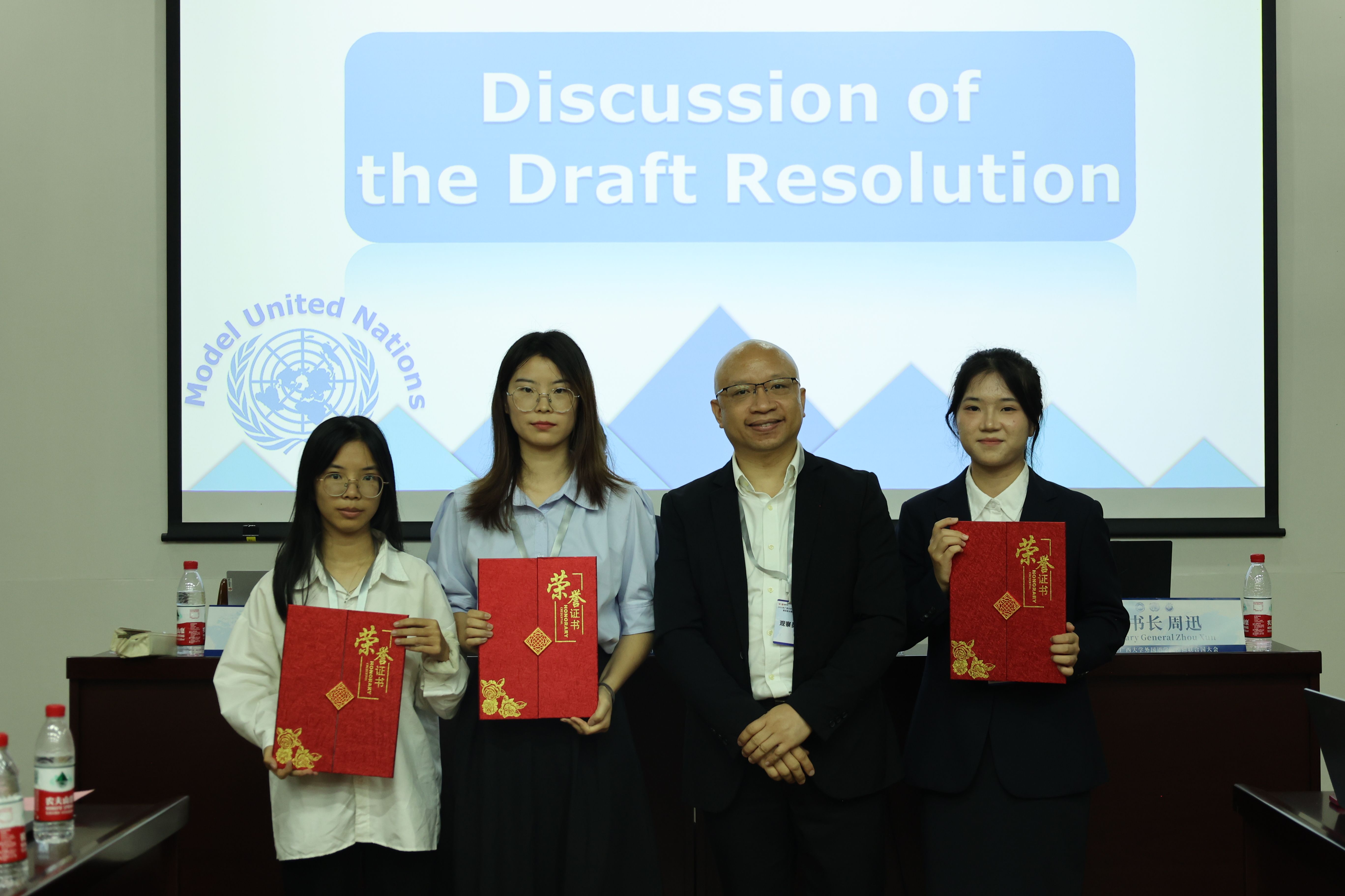 韦乔钟老师(右二)为最佳外交官颁奖,从左至右依次为:23外国语言文学班易明霞(美国代表团)、英语232班梁艺林(中国代表团)、电气工程学院方琰(法国代表团)