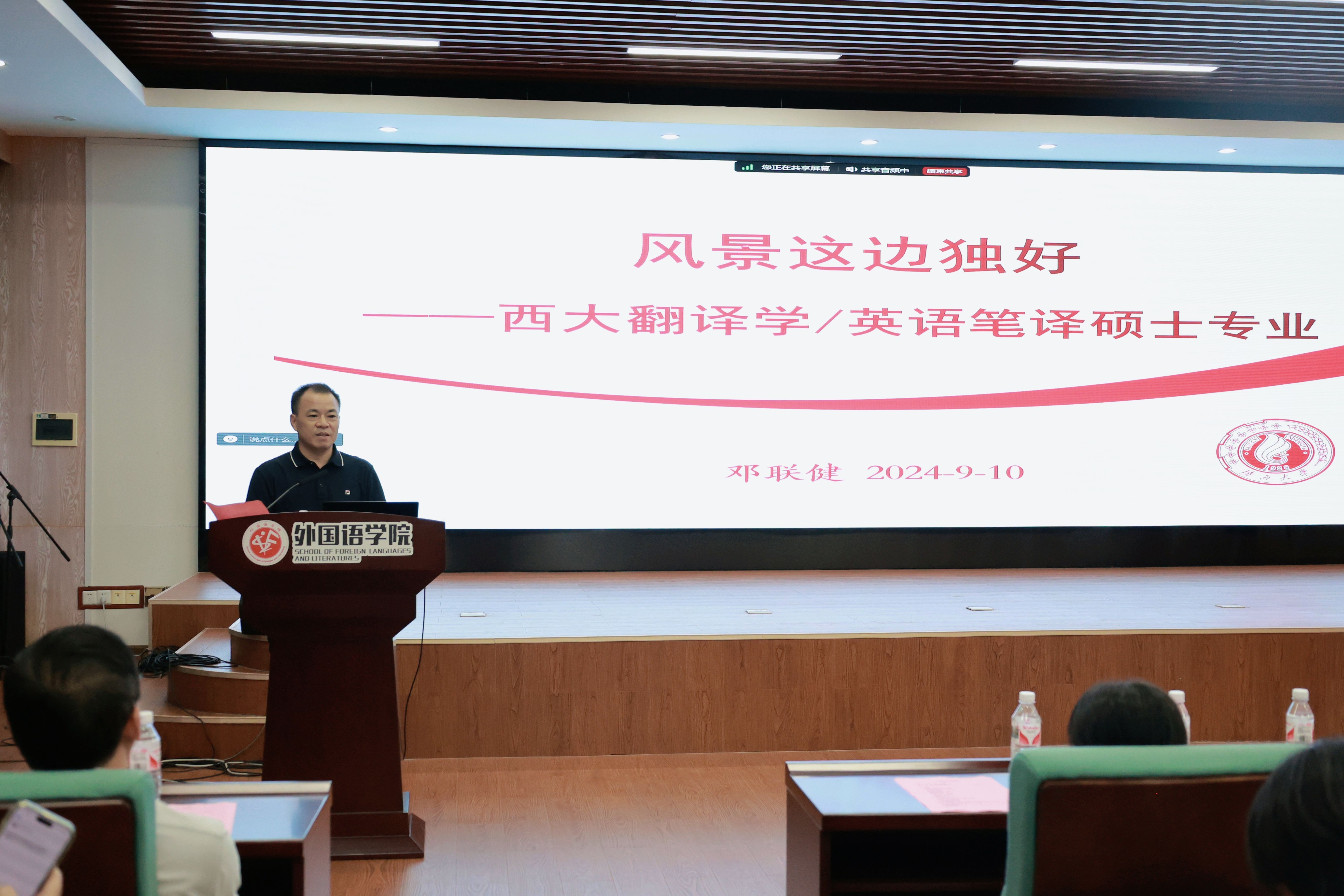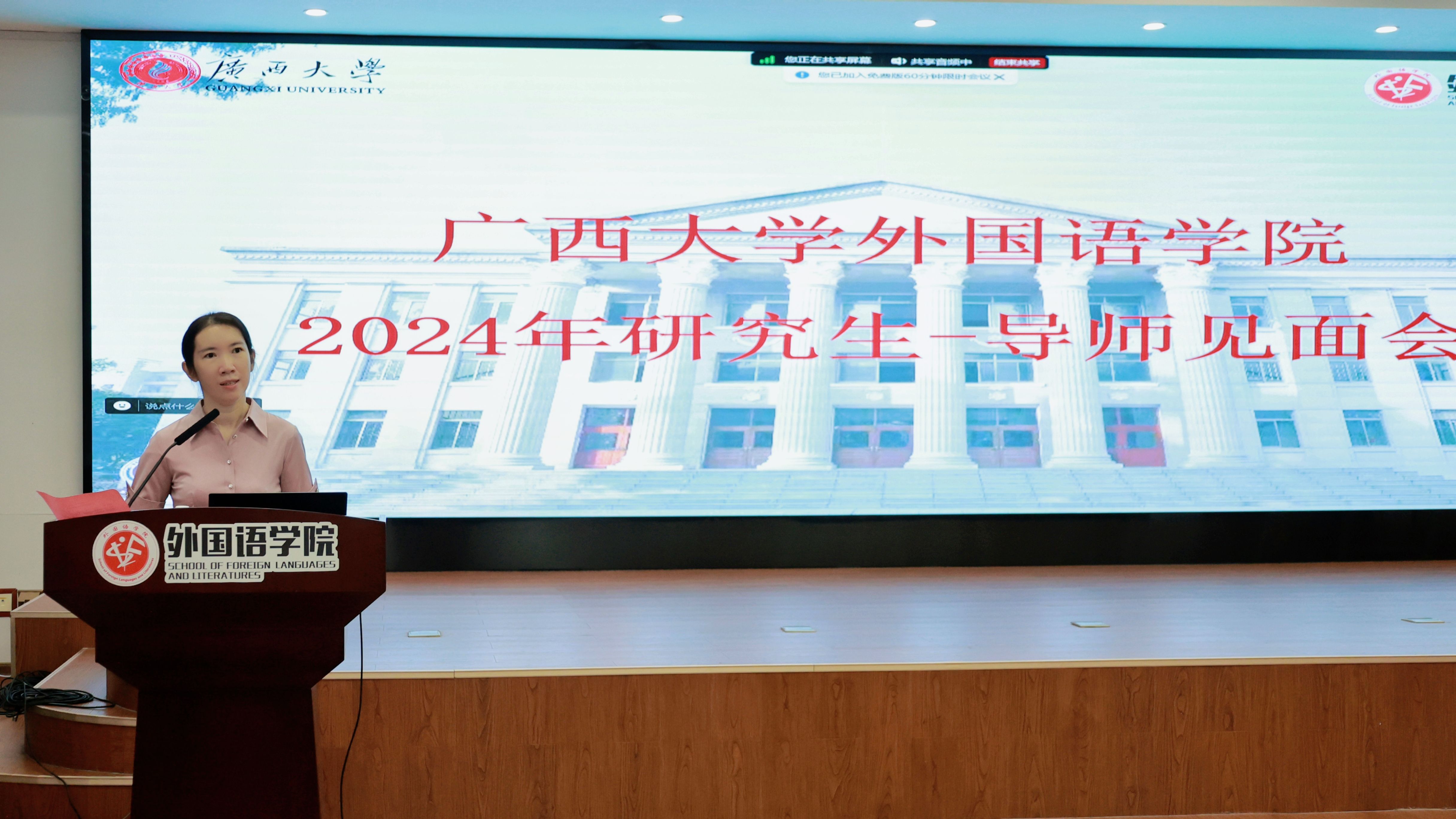白佳芳副院长介绍我院研究生教育及培养情况,为2024级研究生展现了我院雄厚的师资力量、高度的学术水准、完善的培养体系,以及学生丰富的课外生活。紧接着,各学科方向的负责人详述了我院在翻译学、英语笔译、英语语言文学、国别区域研究、日语语言文学、外国语言学及应用语言学、英语口译、日语笔译及越南语笔译等学科方向的研究现状与前景,彰显出我院“风景这边独好”的特色,也让参会同学对各专业有了更为全面的认识。