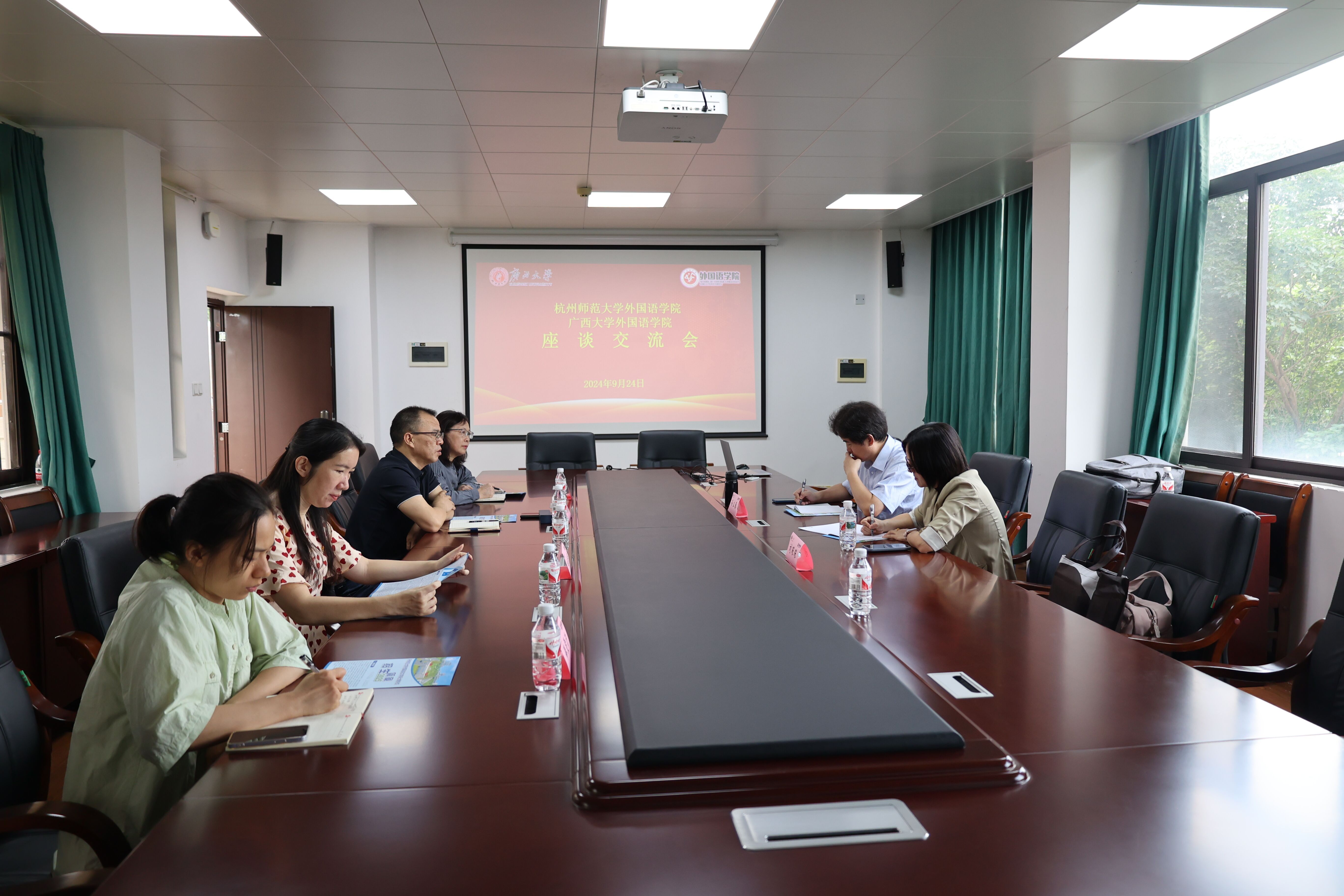 杭州师范大学外国语学院到我院调研交流 2024年9月24日上午,杭州师范大学ok138太阳集团古天乐孙立春副院长一行2人到我院调研交流。 孙立春副院长介绍了学院基本情况和本次到访调研的目的。我院党委副书记、副院长邓联健对孙立春副院长一行的到来表示欢迎并介绍了我院情况。副院长白佳芳和英文系主任刘英分别介绍了研究生和本科生教学情况。随后,双方围绕学科建设、科研工作、研究生教育教学管理工作等方面进行了深入交流与探讨。 (座谈会现场)