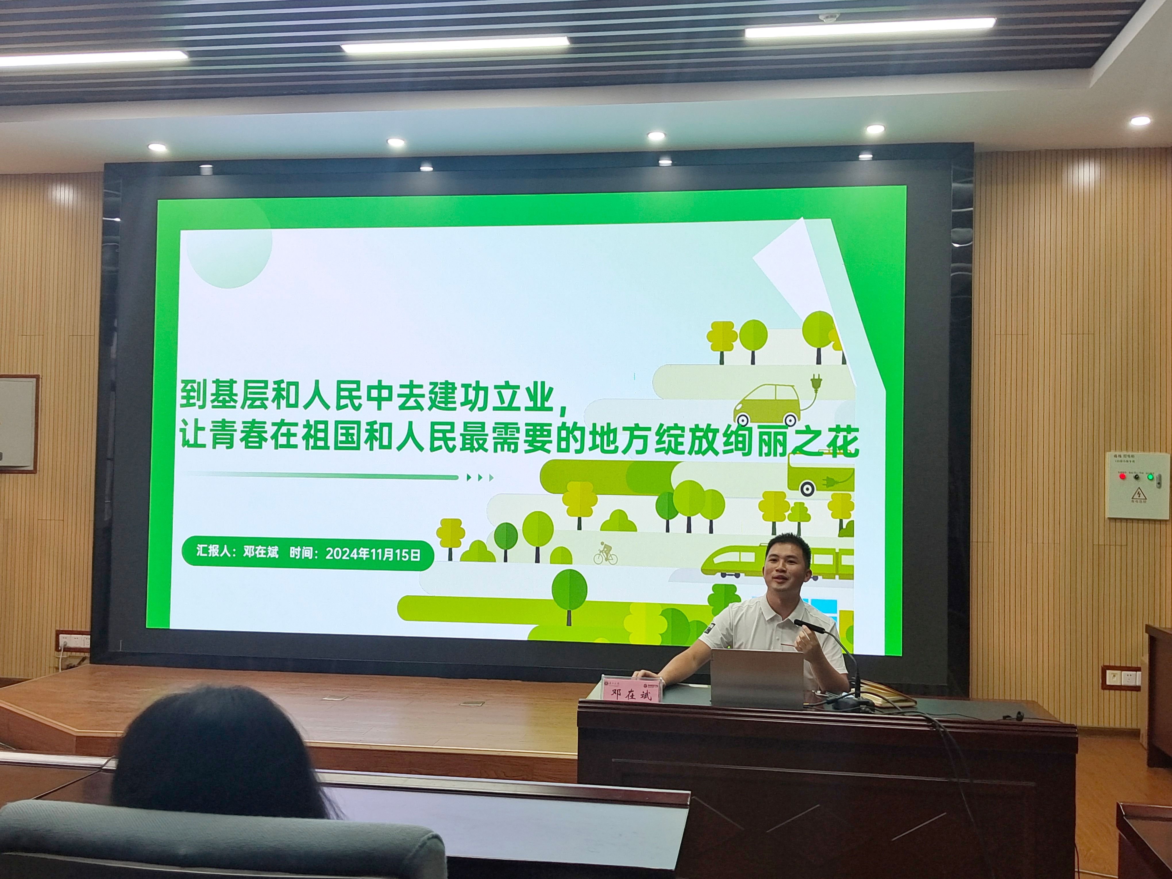 白松柏为我院2020级外国语言文学专业硕士研究生,2023年通过定向ok138cn太阳集团529选调生的选拔,现任乐业县人民政府办公室四级主任科员,挂任乐业县幼平乡百安村驻村工作队员兼党支部书记助理。他首先追溯了选调生工作的发展历程,介绍了选调生的选拔、培养及提拔流程,ok138cn太阳集团529定向选调生的招录情况以及学校的支持政策和选调生在不同地区的待遇政策,分享了选调生面试准备策略和技巧。最后,他还邀请学院到百色乐业县开展社会实践项目,鼓励学弟学妹们牢记习近平总书记的嘱托,到基层去锻炼,把论文写在祖国的大地上。