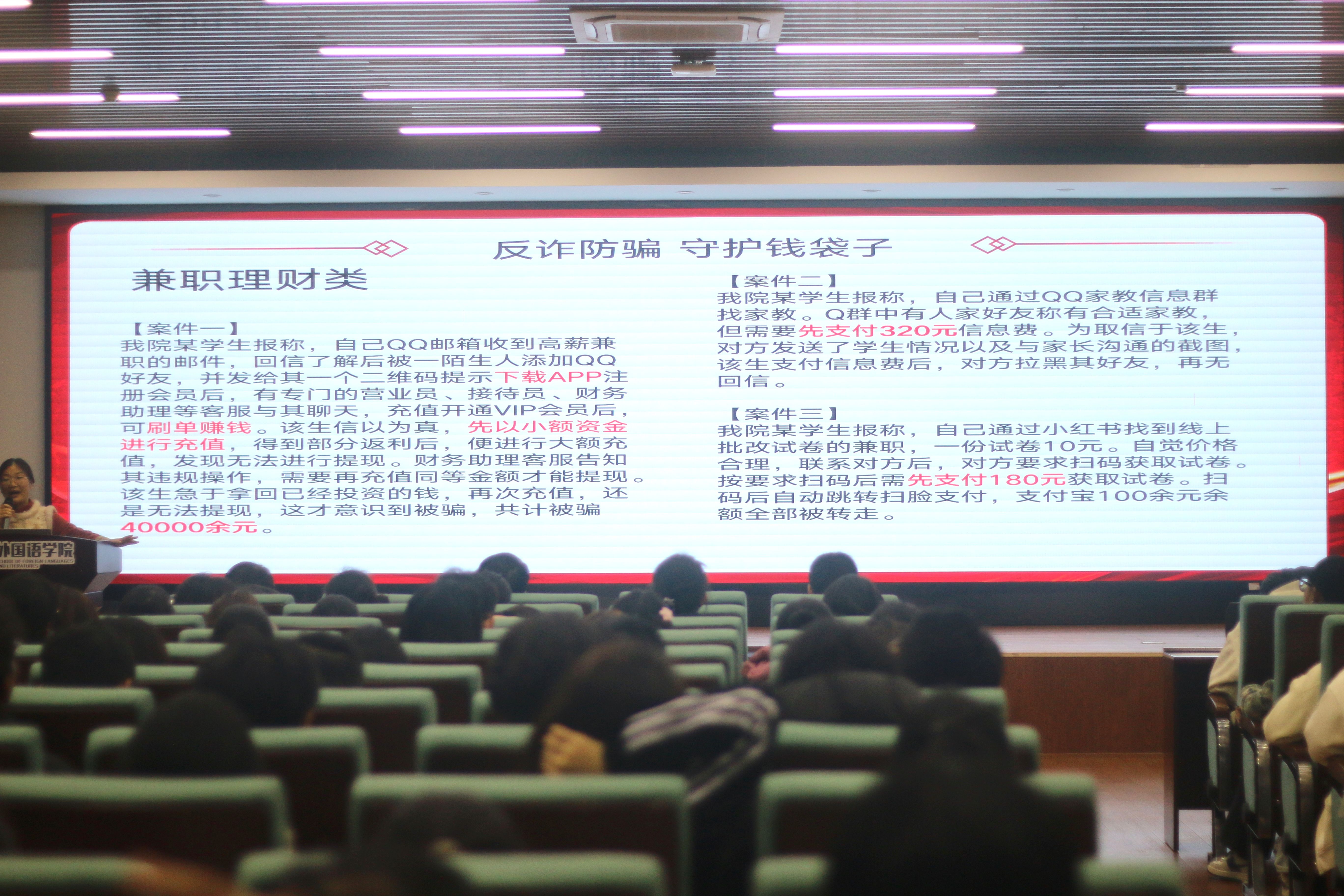 为保障同学们的财产安全,韦霜霜老师通过我校发生的真实案例引入主题,从学生群体高发电诈案件类型、反诈基本知识、各种诈骗手段的辨识技巧等多方面进行了详细讲解,包括兼职理财类、抽奖网购类、冒充熟人类、机票退改签类、影响征信类等常见诈骗类型,剖析不法分子作案手段和作案套路,并强调了未知链接不点击、陌生来电不轻信、个人信息不透露、转账汇款多核实的“三不一多”原则。