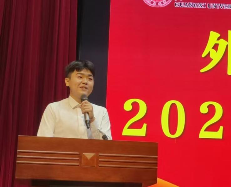 袁卓喜教授作为教师代表讲话。袁卓喜教授博士毕业于上海外国语大学,主持国家社科基金项目2项、广西社科规划课题1项、自治区教育改革工程项目2项,公开发表研究论文三十余篇,出版学术著作3部,为地方政府政务门户网翻译外宣新闻逾100万字。