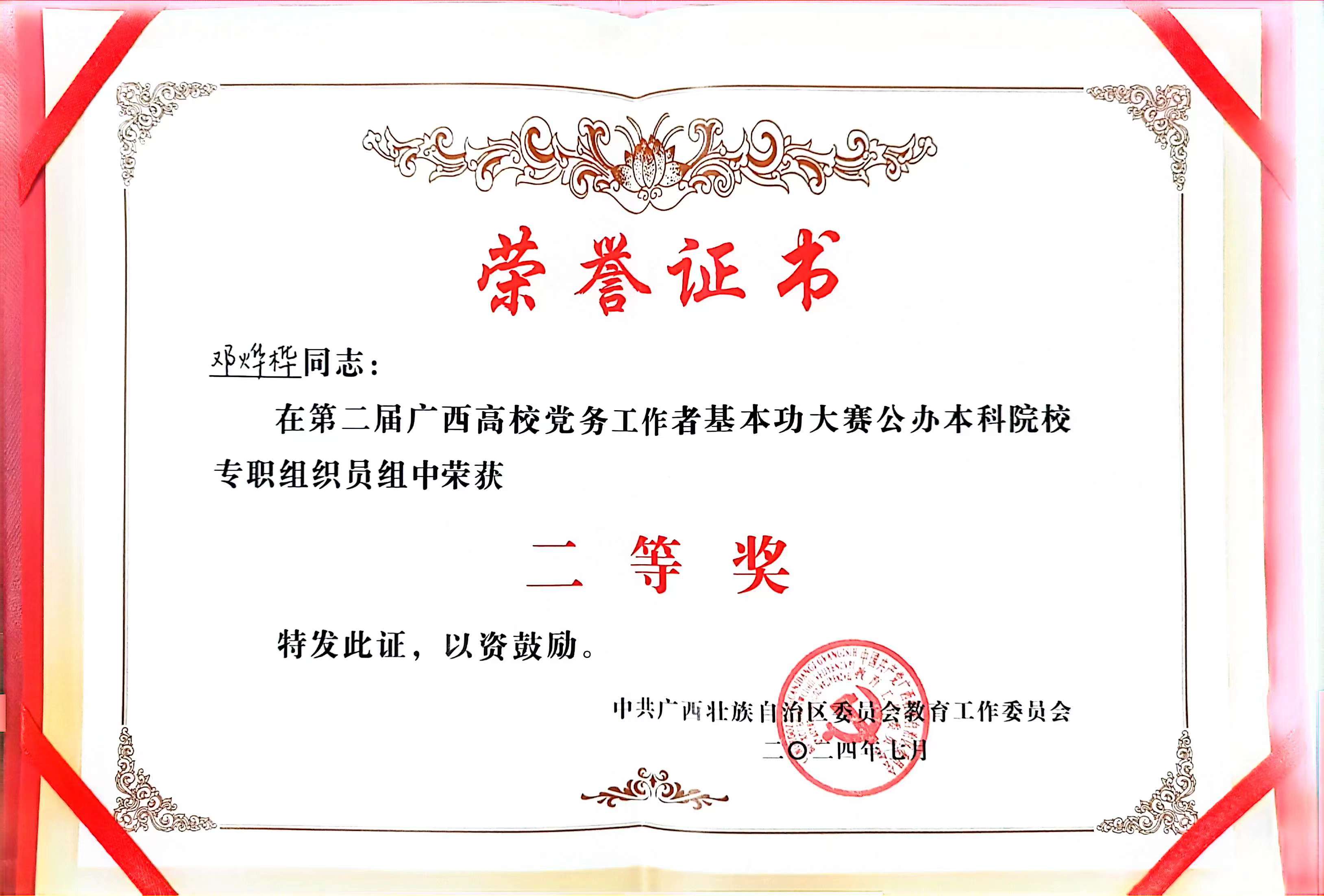 7月10日,第二届广西高校党务工作者基本功大赛在桂林理工大学圆满落下帷幕。我院邓烨桦老师代表ok138cn太阳集团529参加专职组织员组比赛,经过激烈角逐,荣获二等奖。