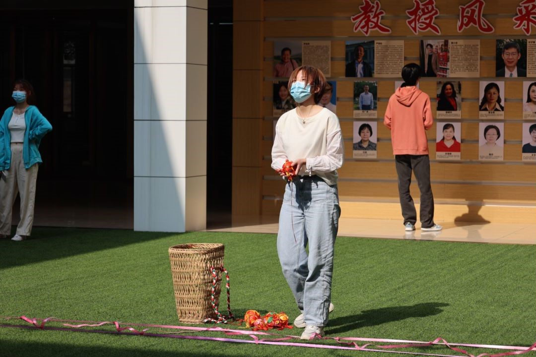 抛绣球活动是广西三月三最为流行的传统体育项目之一,在本次活动中由由21级外国语言文学班承办,于学院一楼的中央空地进行。每个参与者有10次抛绣球机会,投进框内4个即可获得积分。该活动因简单易上手,吸引了大量的学生前来参与。“第一次接触到抛绣球这项活动,感受到乐趣的同时,也体会到了壮族三月三节日的氛围。”21外国语言文学班的李亚澜表示。