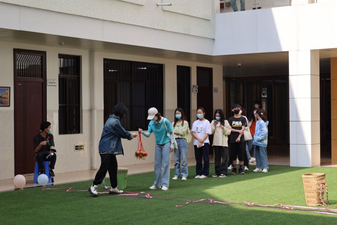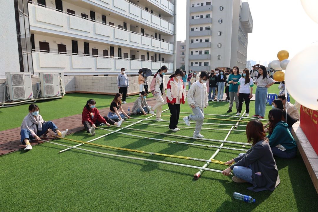 “竹竿舞闯关”活动由21英语笔译班承办,于学院三楼的大平台顺利开展。竹竿舞闯关比赛十分考验同学们的肢体协调能力,参与者需三人组队,按照“开-合-开-开-合”的指令动作,顺利完成一个来回即可获得积分。该活动充满趣味性和挑战性,吸引了大量参与者,21英语笔译班的甘正扬表示:“跳舞者不熟练或胆怯,就会被竹竿夹住脚,持竿者便会用竹竿抬起被夹到的人往外一倒,这时机灵敏捷的同学往往会胜出。”