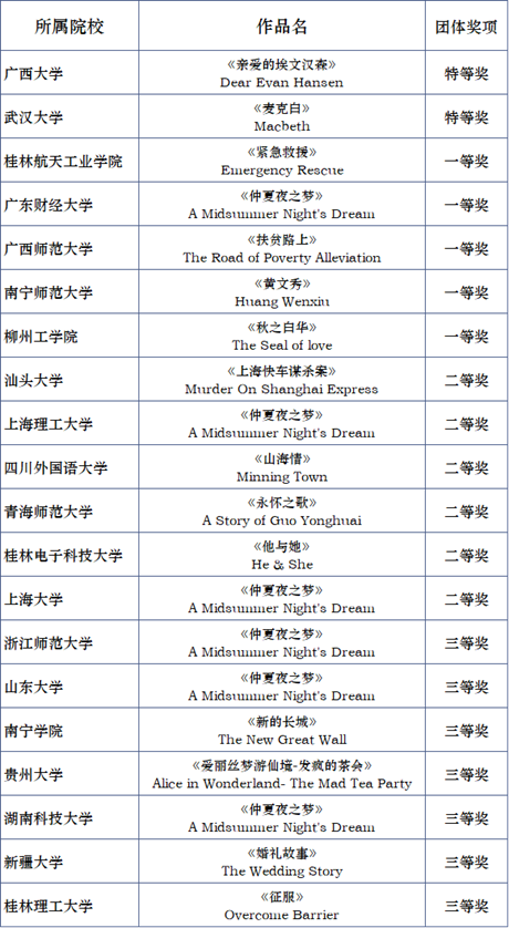 由国内外外语届著名学者和教授组成的5人评审委员会经过紧张细致地观看,于2022年1月12日评出特等奖2名,分别为ok138cn太阳集团529的《亲爱的埃文汉森》和武汉大学的《麦克白》;一等奖5名,它们是桂林航空工业学院的《紧急救援》、广东财经大学的《仲夏夜之梦》、广西师范大学的《扶贫路上》、南宁师范大学的《黄文秀》和柳州工学院的《秋之白华》;汕头大学等6所院校获得二等奖;其余7所院校的参赛作品获得三等奖(具体获奖名单如下表)。