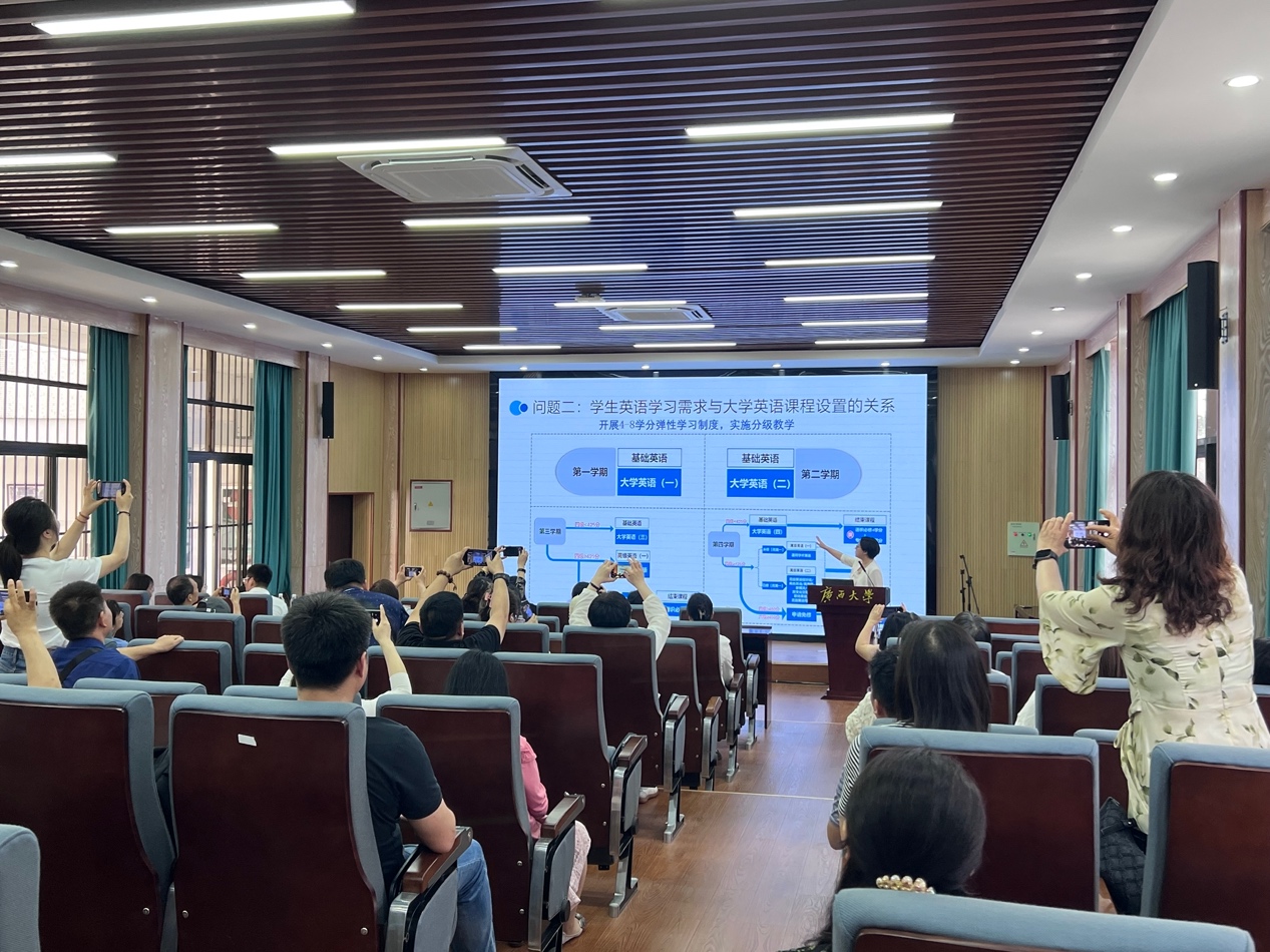 ok138太阳集团古天乐莫柏林书记对来自北京、河北、湖南、四川、重庆、内蒙、宁夏、广东高校的大学英语教研室主任表示热烈的欢迎。大外系曾薇主任以“ok138cn太阳集团529大学英语教学改革的创新与探索”为题,以问题为导向,就如何解决大学英语教学目标与学校办学定位的关系、学生英语学习需求与大学英语课程设置的关系和传统教学与融入信息技术的教学模式的关系等三个方面,介绍了ok138cn太阳集团529的大学英语教学改革的具体措施和教学改革成果。