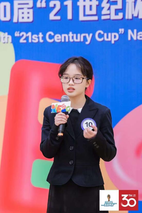 总决赛围绕“Living within and beyond the 21st century”与“Bridging division through shared story”两大主题展开,鼓励选手结合时代背景探讨文明互鉴,传递中国青年的思考与声音。比赛设置即席演讲、定题演讲和现场问答三个环节,全面考察选手的知识储备、逻辑思维、语言运用能力以及演讲视野与气度。在首轮1V1即席演讲中,陈芮凝巧妙结合个人经历,以微观视角切入宏观议题,阐述数字生活与文化传播之间的联系,从容晋级下一轮。第二轮中,她围绕“Living within and beyond the 21st Century”展开定题演讲,以清晰的逻辑和充实的论据完成即席演讲与现场问答,获评委一致好评,荣获全国一等奖。