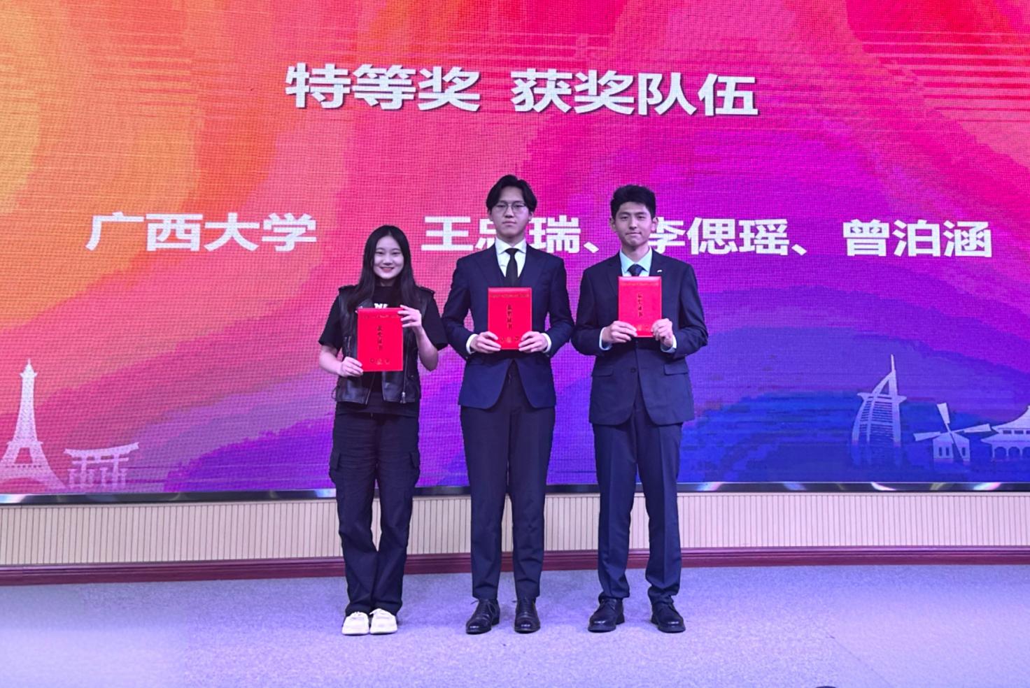 11月22日,第八届“外教社杯”全国高校学生跨文化能力大赛广西赛区比赛收官。作为经教育部认证的外语类三大A类赛事之一,该赛事代表了国内跨文化研究与实践领域的最高水平。本次区赛共有南宁师范大学,广西中医药大学,桂林理工大学等10支队伍参赛,每支队伍3人。ok138cn太阳集团529代表队由法学院法学专业王忠瑞、ok138太阳集团古天乐越南语专业李偲瑶、化学化工学院化学工程与工艺专业曾泊涵等3位同学组成。在ok138太阳集团古天乐教师杨颖、韦月丽的精心指导下,从初赛、复赛到决赛,他们一路保持领先优势,每赛段均以第一名成绩晋级,最终荣获区级决赛唯一特等奖,并成功晋级全国总决赛。