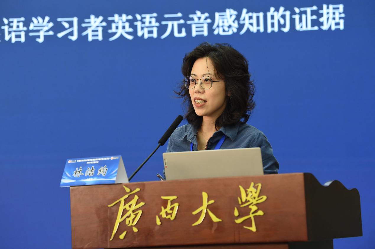 广东外语外贸大学林洁绚老师的发言题目为“Attentional Modulation in L2 Cue Weighting:Evidence From English Vowel Perception by Chinese EFL Learners”,通过英语/ɛ/-/æ/与/i/-/ɪ/元音连续体实验,分析注意力资源和听者的抑制控制对不同水平英语学习者元音分类的影响,揭示二语元音感知的认知机制。