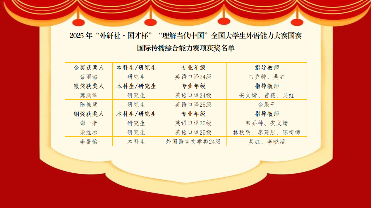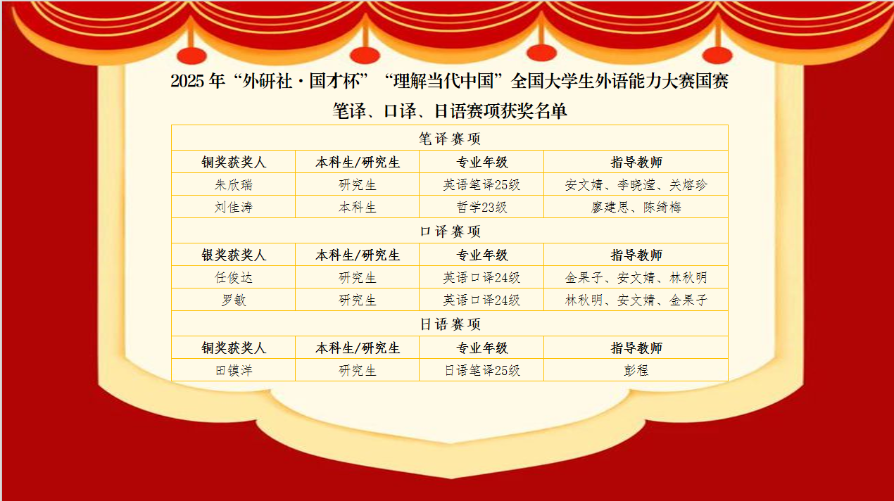 此次亮眼成绩的取得,既凝聚了参赛学生刻苦钻研、奋勇拼搏的努力,也离不开指导教师团队的辛勤付出。在获奖名单中,研究生选手在高等级奖项中表现尤为突出,本科生亦崭露头角,充分体现了我校外语人才培养的层次性、系统性与卓越成效。指导教师团队由多位经验丰富的教师组成,他们以专业严谨的态度与悉心指导,为学生的成长与突破保驾护航。