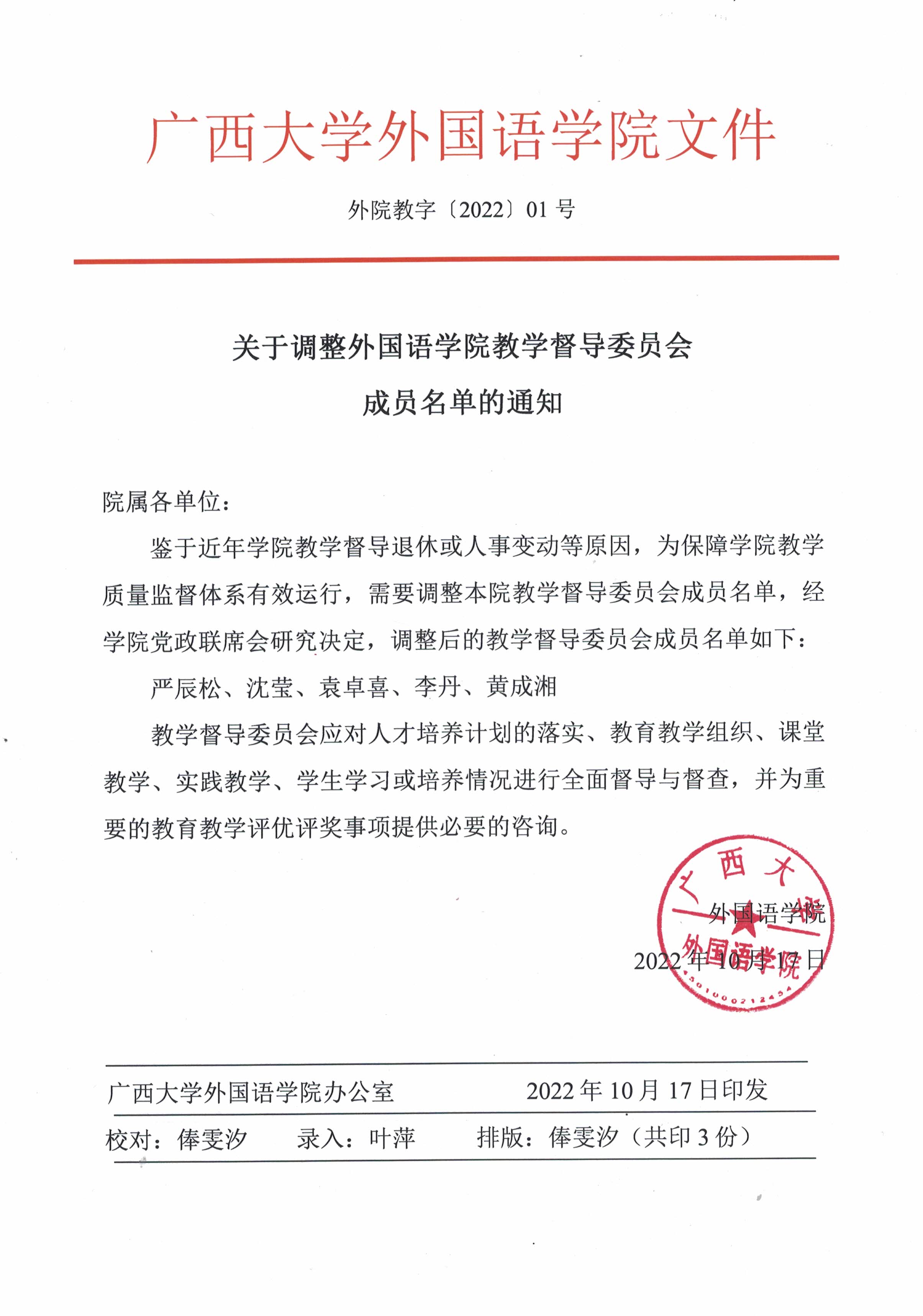 【本教文件】关于调整ok138太阳集团古天乐教学督导委员会成员名单的通知