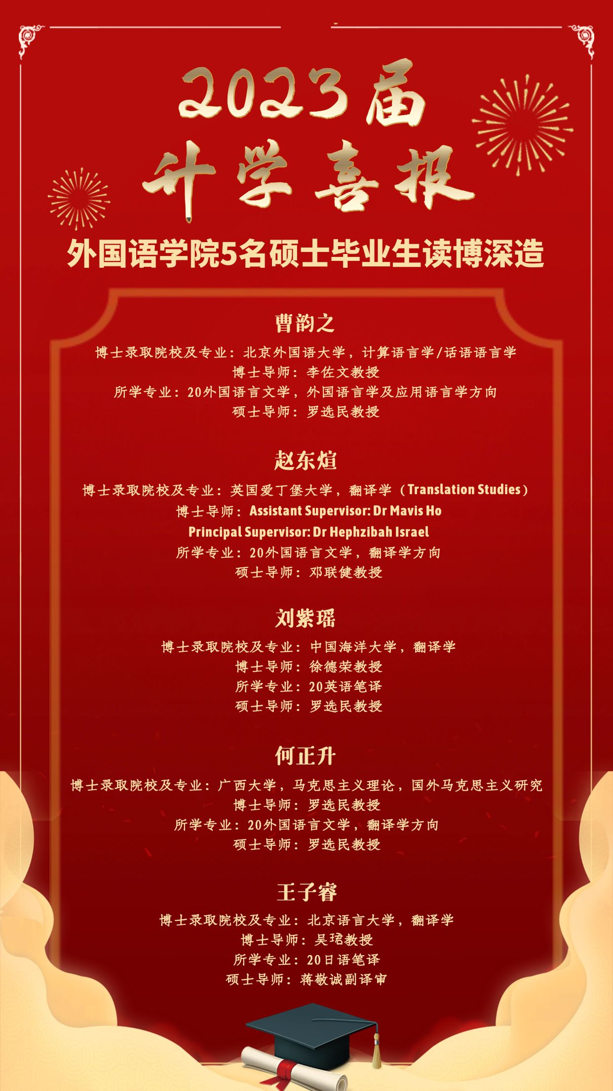 2023届升学喜报|ok138太阳集团古天乐5名硕士毕业生读博深造