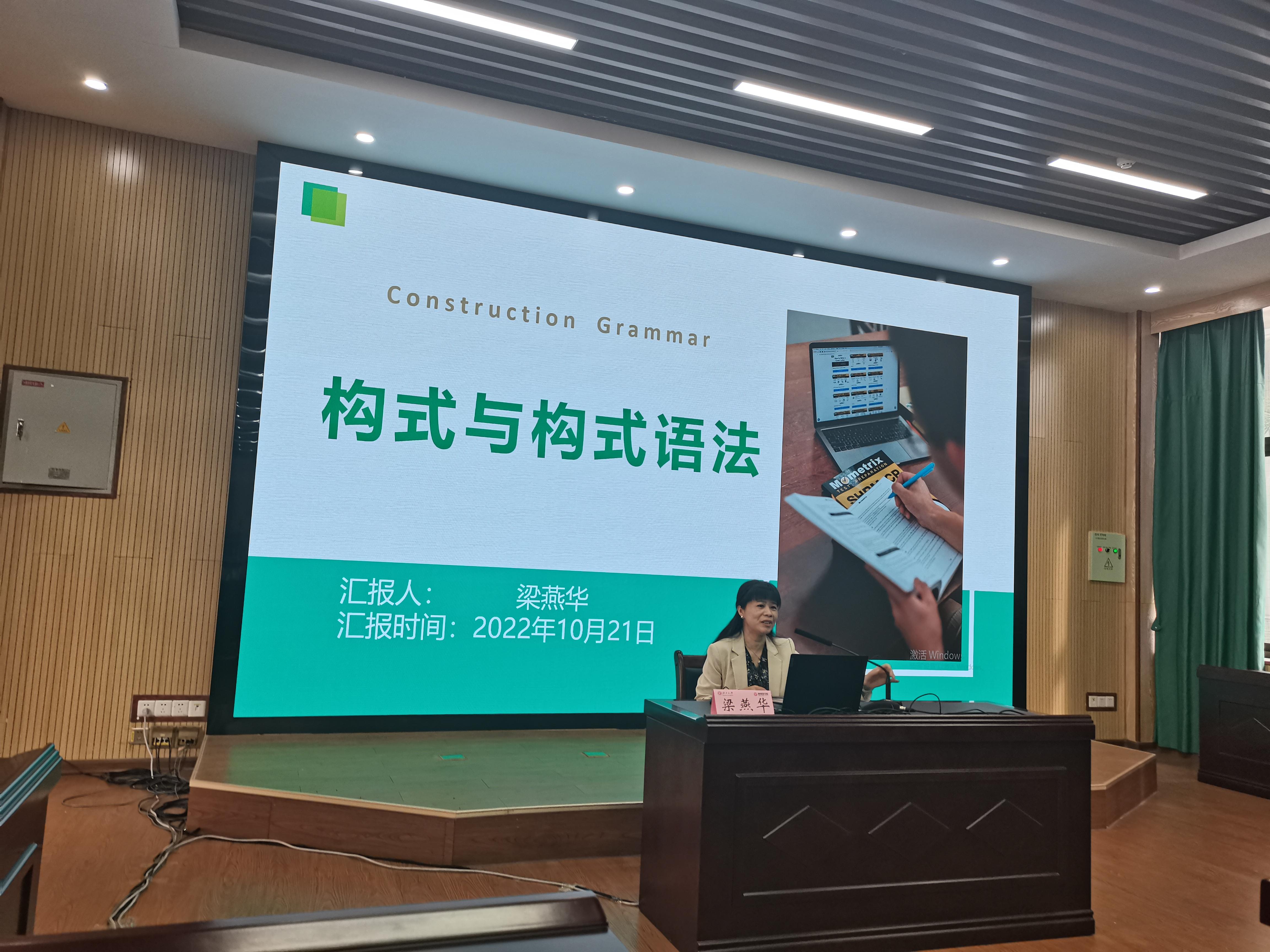 10月21日下午,ok138太阳集团古天乐语言学学科群“经典阅读活动”在我院融通厅顺利开展。本次经典阅读活动由严辰松教授主持,梁燕华教授作为主讲人,给大家带来Construction at Work--The Nature of Generalization in Language及Constructions: A Construction Grammar Approach to Argument Structure两本书的解读,并就“构式与构式语法”与老师同学们展开讨论。