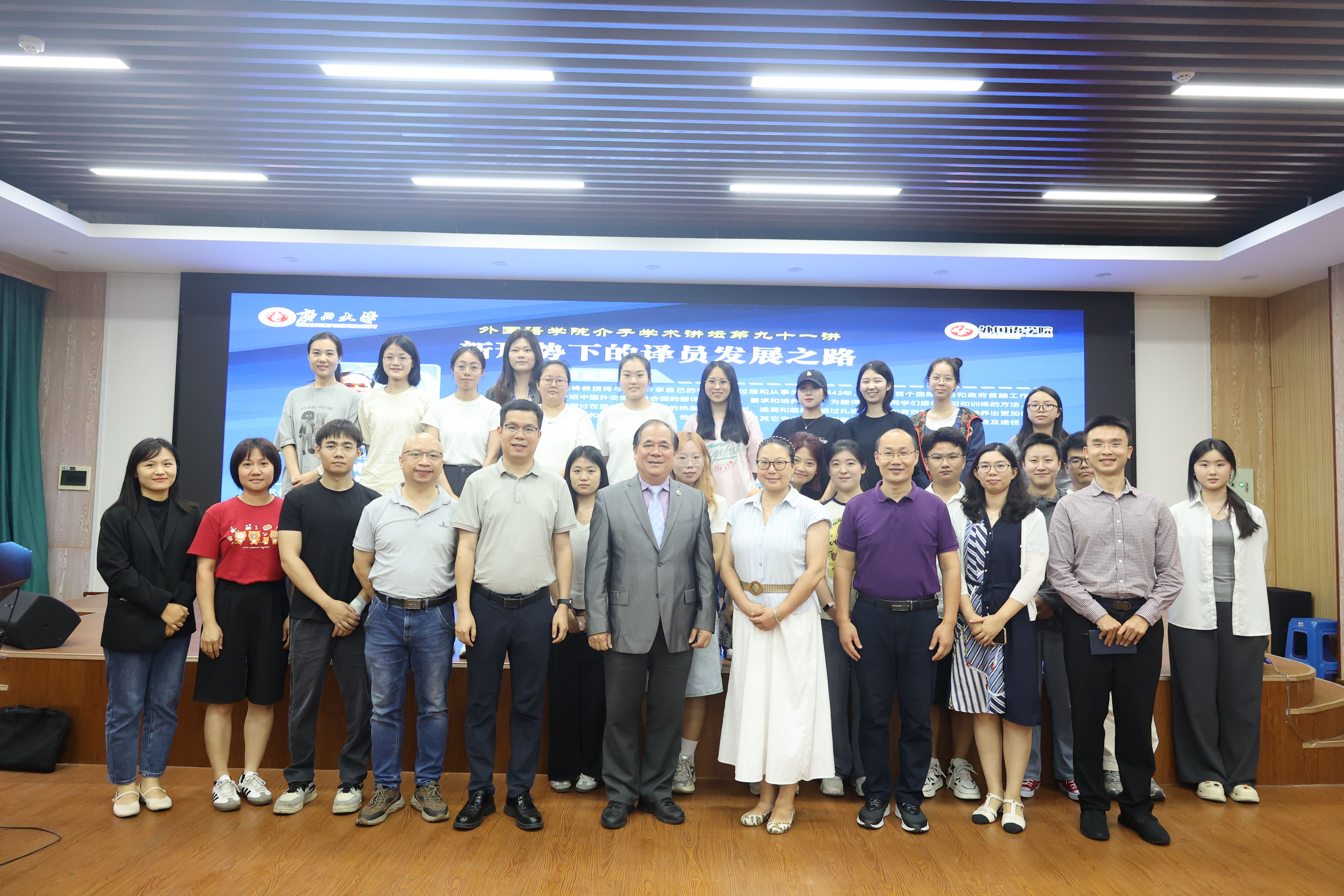 5月15日下午,ok138太阳集团古天乐介子学术讲坛第九十一讲在ok138太阳集团古天乐求是报告厅顺利举行,北京外国语大学陈峰教授为听众带来题为“新形势下的译员发展之路”的学术讲座。自治区外事办公室翻译室主任沈菲、南宁市外事办公室副主任梁健、南宁市外事办公室翻译室主任张颖莹以及我院师生共40余人参加讲座,讲座由袁卓喜教授主持。