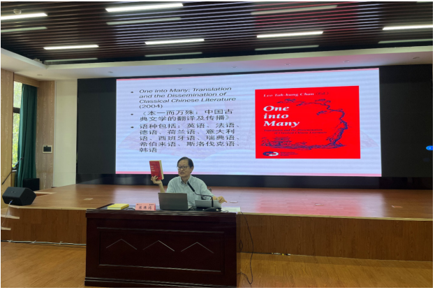 讲座伊始,陈教授介绍了他的两本专著:《本一而万殊:中国古典文学翻译及传播》和《再述历史:西方翻译中的前现代中国文本》,从中提出了古典文学外译的理论,翻译研究中有待全面探索的,是将经典著作从一种语言翻译成多种语言的现象。