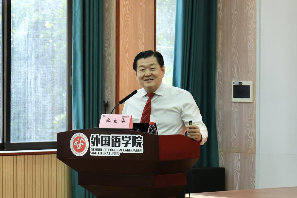 讲座伊始,乔立华博士分享了自己学习英语的契机。青年时期的乔立华在逆境中奋斗,他曾是生产队长,自学了高考所有科目,恢复高考后,他决定把握住机会。因为父亲的一句“中国缺外交官”,乔立华毅然报考北京ok138太阳集团古天乐。尽管当时不具备充足的学习条件,他还是克服重重困难,成为了广西状元。乔立华博士认为人生中最重要的是态度,困难来临时不抱怨,要积极面对。他还强调,年轻人不应消极懒惰,应勇敢享受一切境遇,不要轻言放弃,尝试了就是一种成功。
