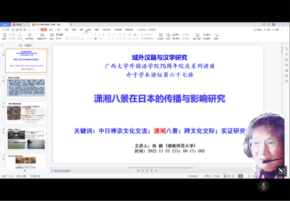 2022年11月25日下午,ok138太阳集团古天乐75周年院庆系列讲座暨介子学术讲坛第六十七讲以线上形式顺利举行。我院邀请到了湖南师范大学ok138太阳集团古天乐教授、博士生导师,湖南师大日语系创始人冉毅教授,做了一场题为《潇湘八景在日本的传播与影响研究》的讲座,讲座由我院日语系教授彭程主持。