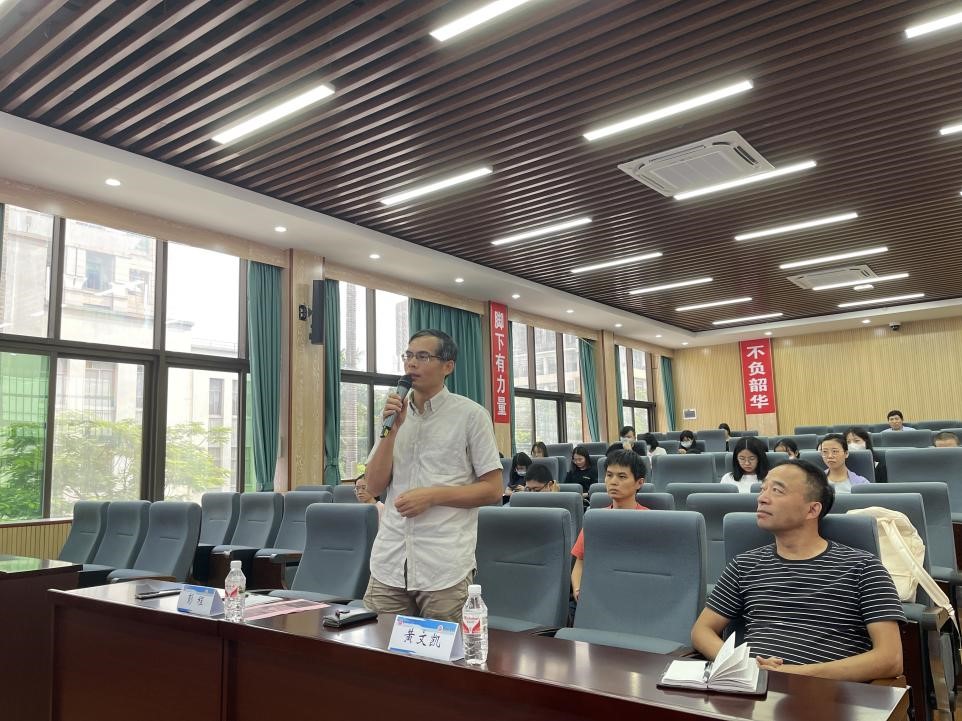 紧接着,黄老师围绕“新文科建设背景下我们该如何做研究”这一问题同在座师生进行了探讨。他引用习近平总书记在哲学社会科学工作座谈会上的讲话说明哲学社会科学的重要性,并指出社会大变革呼吁文科创新,新文科建设是时代之需也是大势所趋。他认为,外语学科具有工具性、人文性和国际性等多重价值属性,外语学科在高等教育中覆盖面广、规模大,是新文科建设中绝不能缺位的重要一环,发展外国语言文学教育和研究也是全球共识。在这样的新文科建设背景之下,我们语言文学,尤其是外国语言文学学科建设和相关研究也亟需新突破、新变化。他表示,外国语言文学学科作为中外文明交流的桥梁,具有跨文化的特殊性,而时代之变也亟需懂外语的高质量复合人才。因此,他鼓励同学们以外语运用能力和综合素养为基础,以跨文化和跨学科的多维学习为导向,在新文科建设背景之下重视并做好跨学科研究。