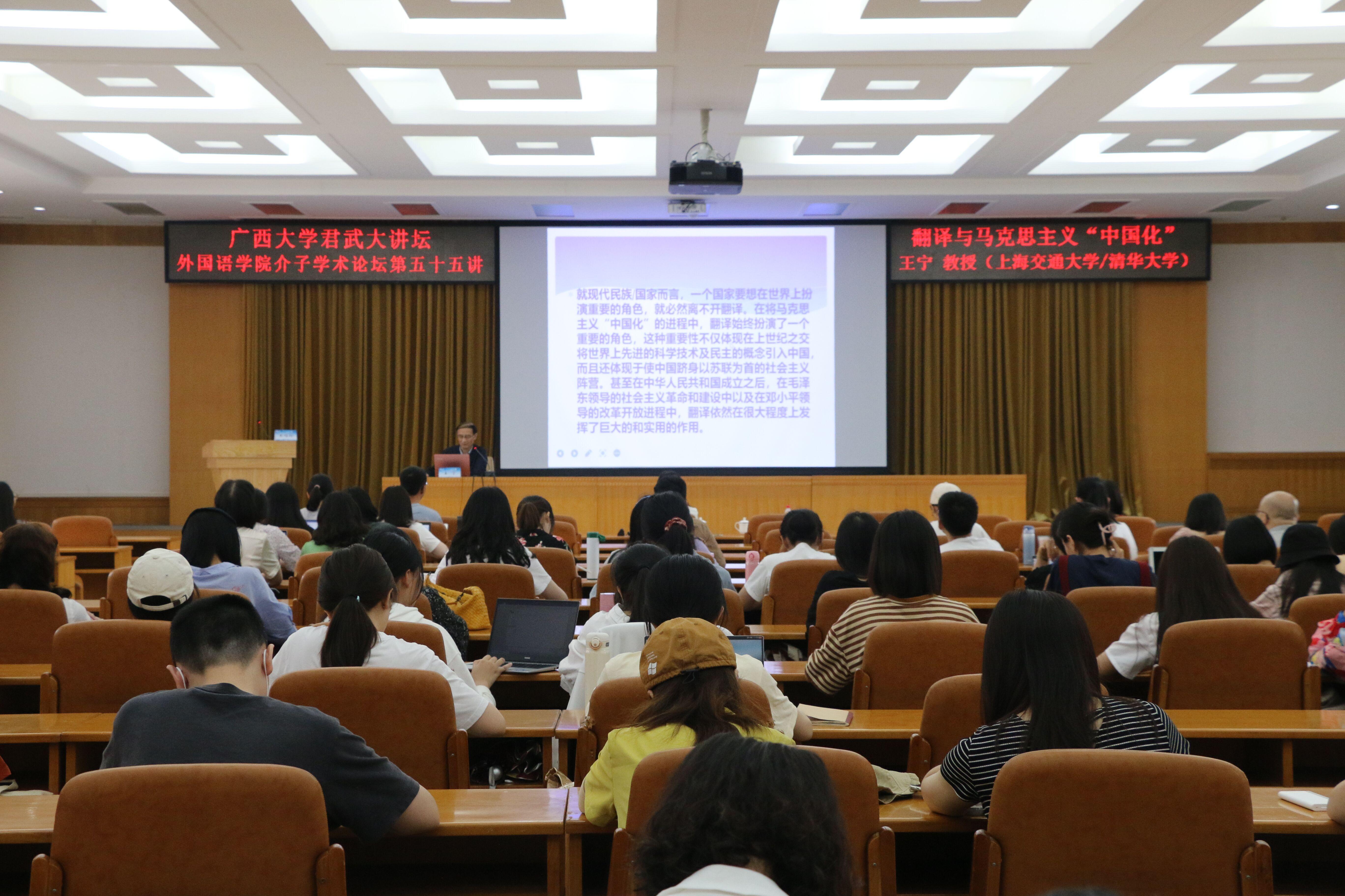 6月4日,ok138cn太阳集团529君武大讲坛系列学术报告暨ok138太阳集团古天乐介子学术讲坛第五十五讲于君武馆玉林厅顺利举行。上海交通大学人文学院院长、清华大学长江学者特聘教授、拉丁美洲科学院院士、欧洲科学院外籍院士王宁教授,应邀来到ok138cn太阳集团529,为我校师生带来题为“翻译与马克思主义‘中国化’”的精彩讲座。
