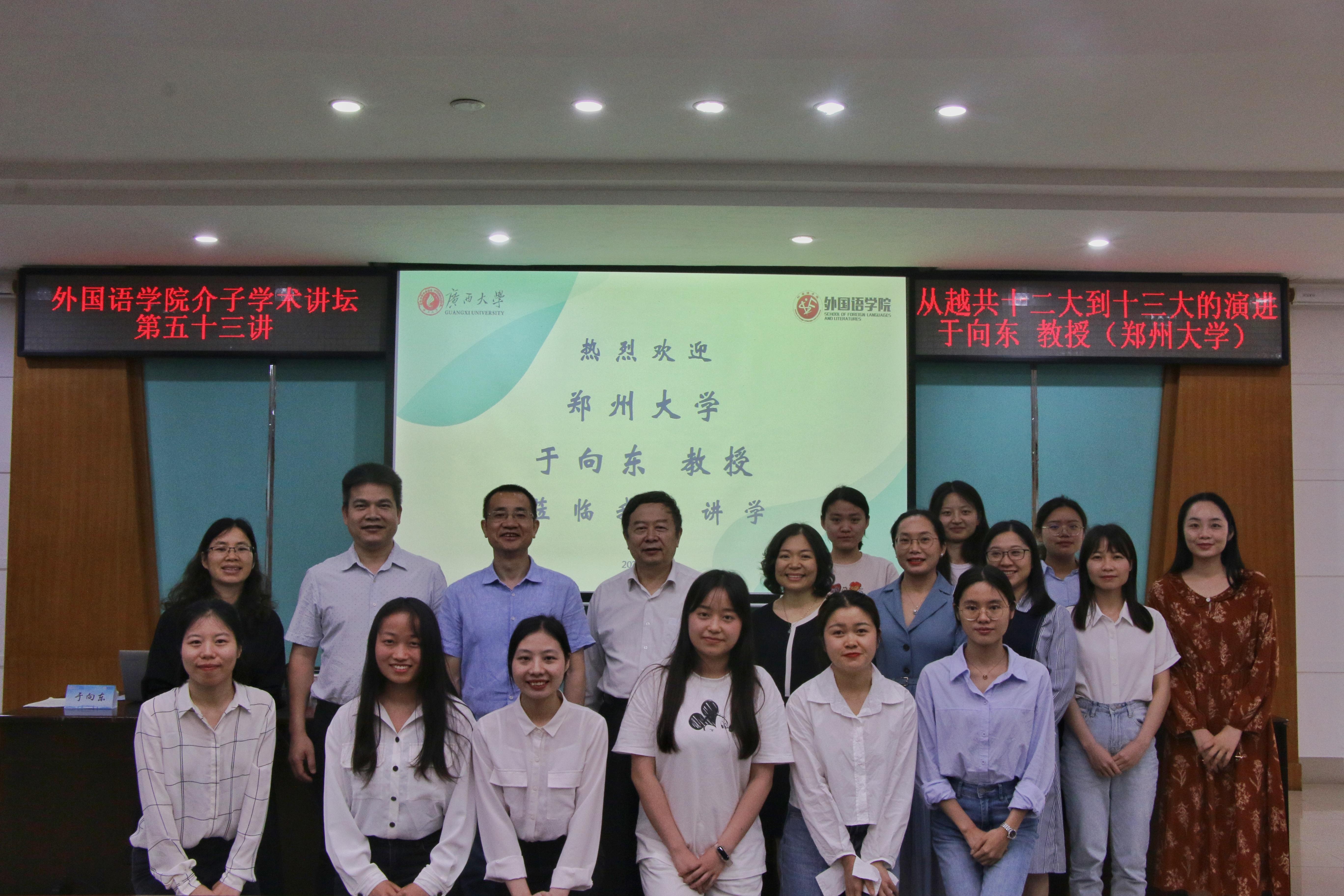 4月25日下午,ok138太阳集团古天乐介子学术讲坛第五十三讲在ok138cn太阳集团529君武馆第二会议室成功举办。郑州大学马克思主义学院教授、博士生导师、越南研究所所长,郑州大学马克思主义学院原院长于向东教授莅临我校,为我院师生带来了题为“从越共十二大到十三大的演进”的精彩讲座,讲座由我院东南亚语系主任祁广谋教授主持。