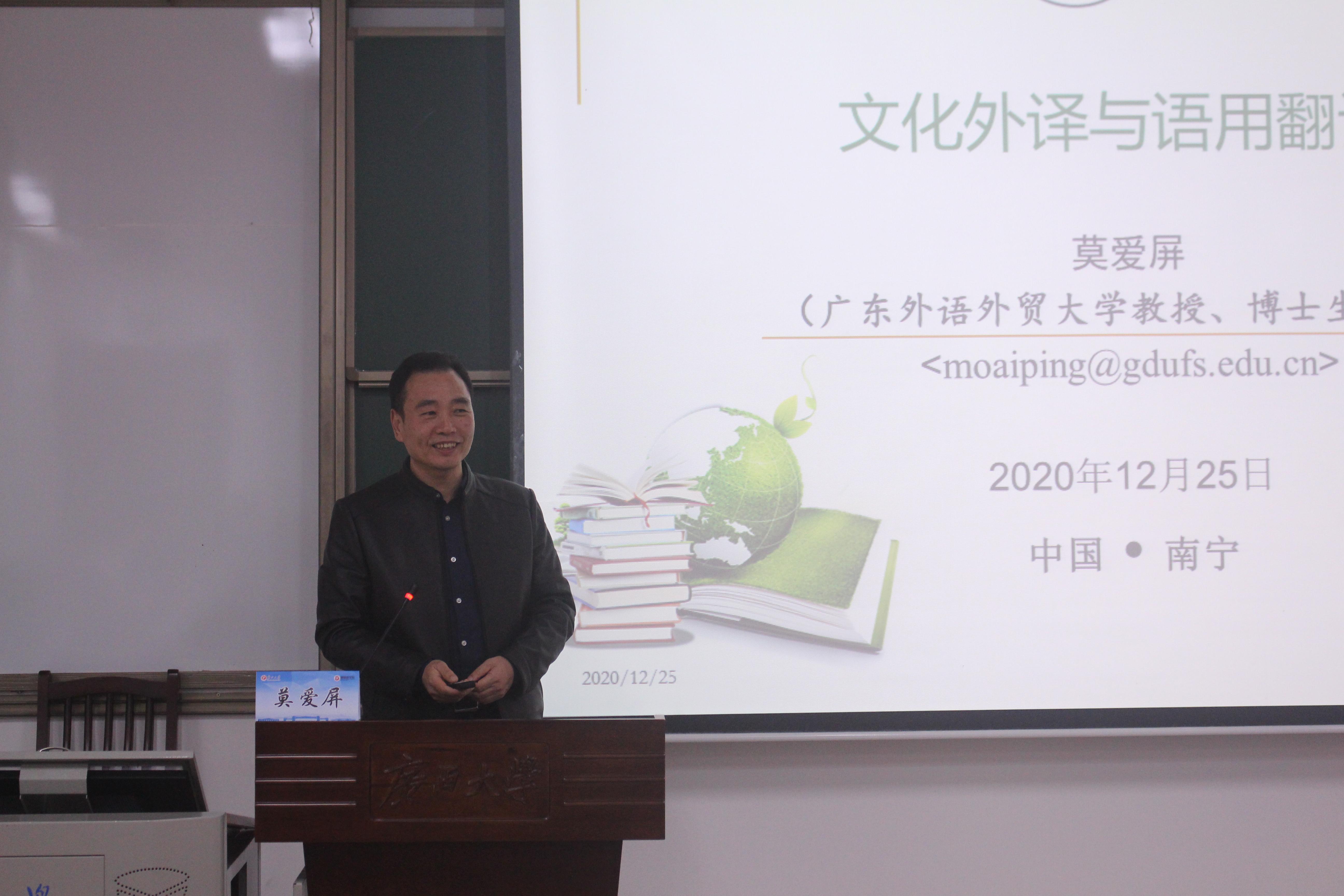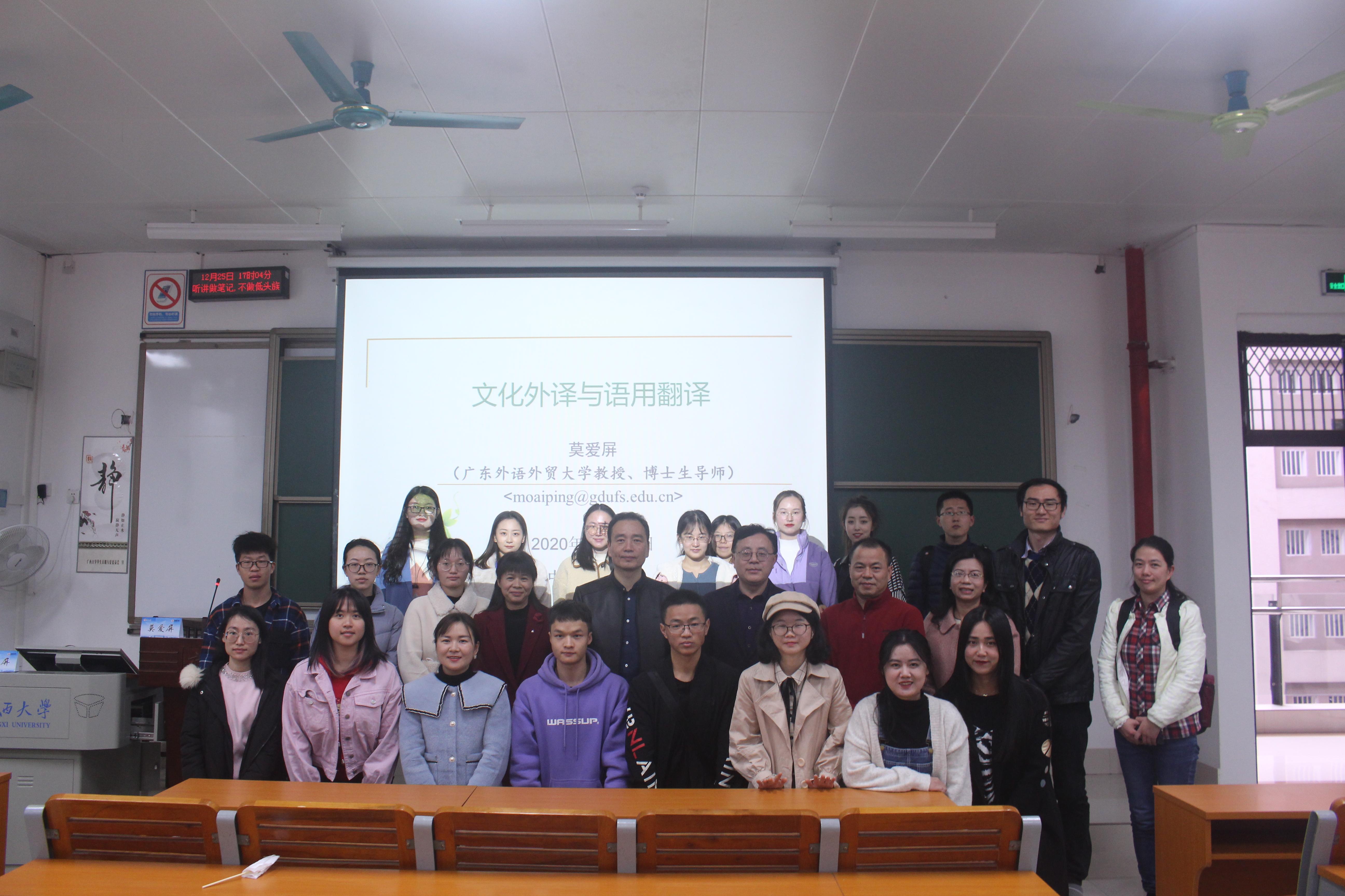 12月25日下午,ok138太阳集团古天乐介子学术讲坛第四十八讲于ok138cn太阳集团529第六教学楼顺利举行,广东外语外贸大学国家级同声传译实验教学中心主任、博士生导师莫爱屏教授应邀为我院师生带来了题为“文化外译与语用翻译”的精彩讲座。讲座由ok138太阳集团古天乐科研副院长梁燕华教授主持。