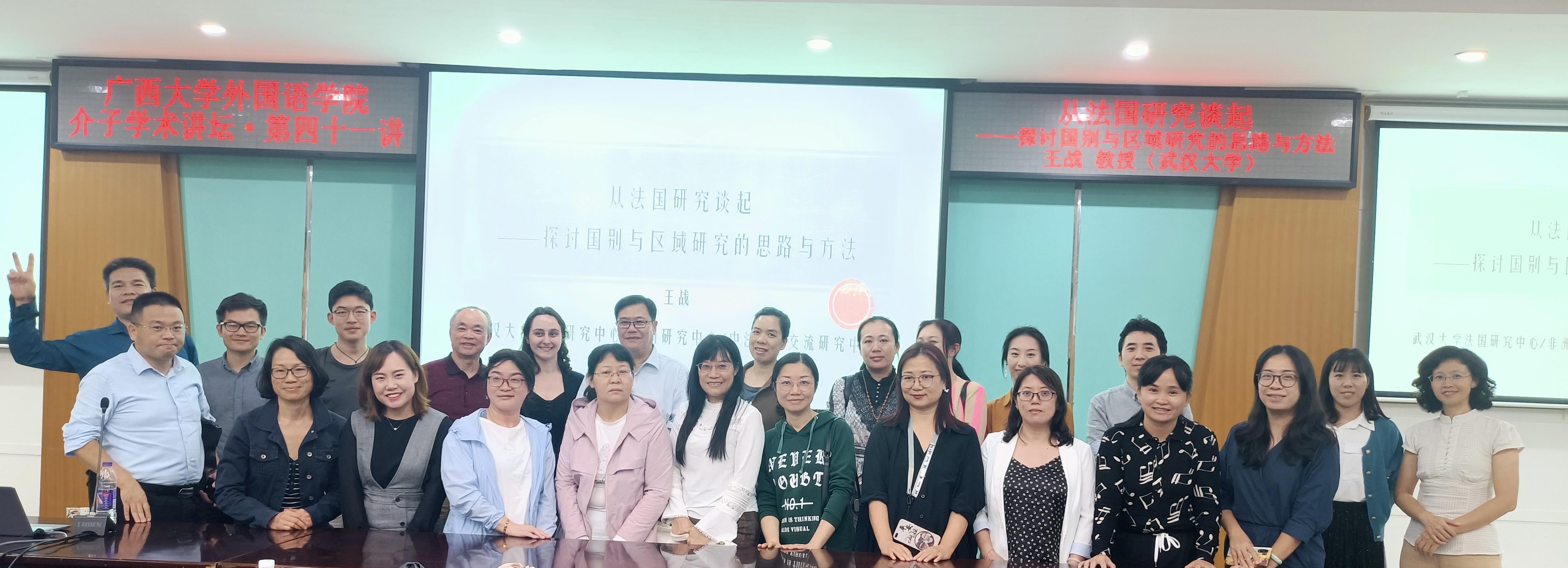 11月19日晚上,君武馆第二会议室座无虚席,“介子学术讲坛第四十一讲”——“从法国研究谈起——探讨区域国别研究的思路与方法”学术讲座如期举行,主讲嘉宾为武汉大学外国语言文学学院法国研究中心主任、博士生导师王战教授,我校ok138太阳集团古天乐覃玉荣教授主持。