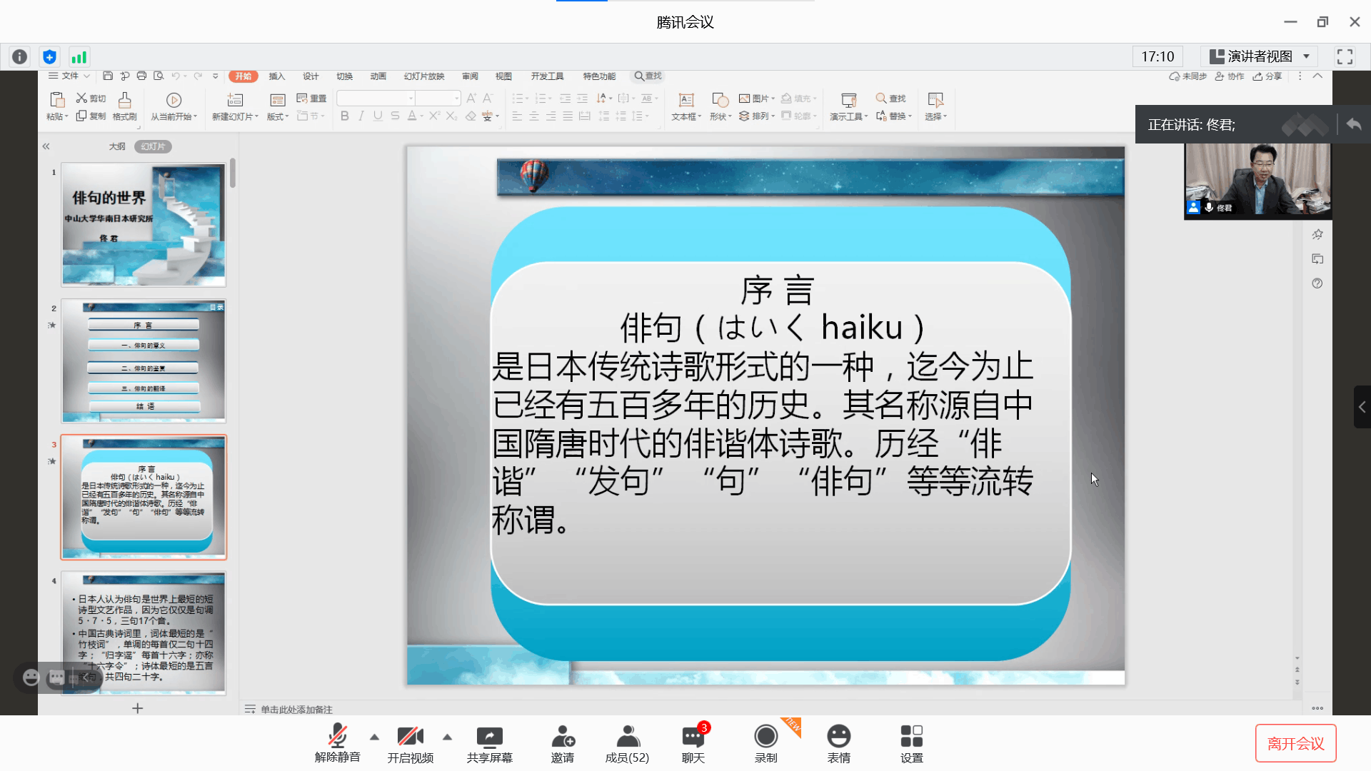 10月20日晚7点,ok138太阳集团古天乐介子学术讲坛第三十七讲通过腾讯会议在线视频圆满举行。中山大学华南日本研究所副所长,广东省本科高校外语类专业教学指导委员会亚非语言专业分委员会副主任委员,《东亚学术研究》编委佟君教授,应我院邀请,以“俳句的世界”为题,为我院师生进行了精彩的线上讲座,带大家走进日本古典诗歌的世界。本次讲座由ok138太阳集团古天乐张贵生博士主持。