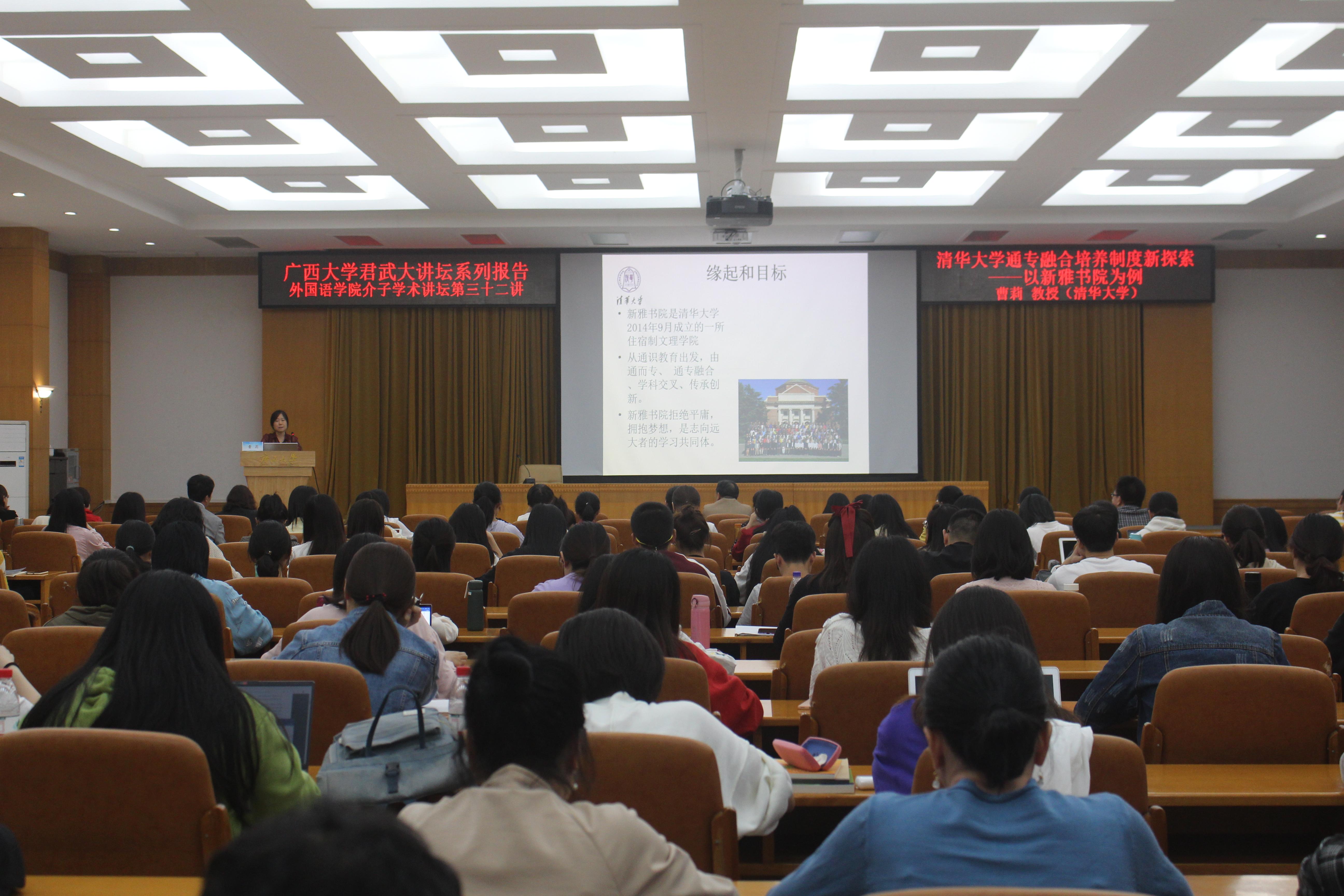 10月11日下午,ok138cn太阳集团529君武大讲坛|ok138太阳集团古天乐介子学术讲坛第三十二讲于君武馆玉林厅顺利举行。清华大学长聘教授、博士生导师曹莉教授,应邀到我校作题为《清华大学通专融合培养制度新探索——以新雅书院为例》的报告。报告会由ok138太阳集团古天乐院长罗选民教授主持。