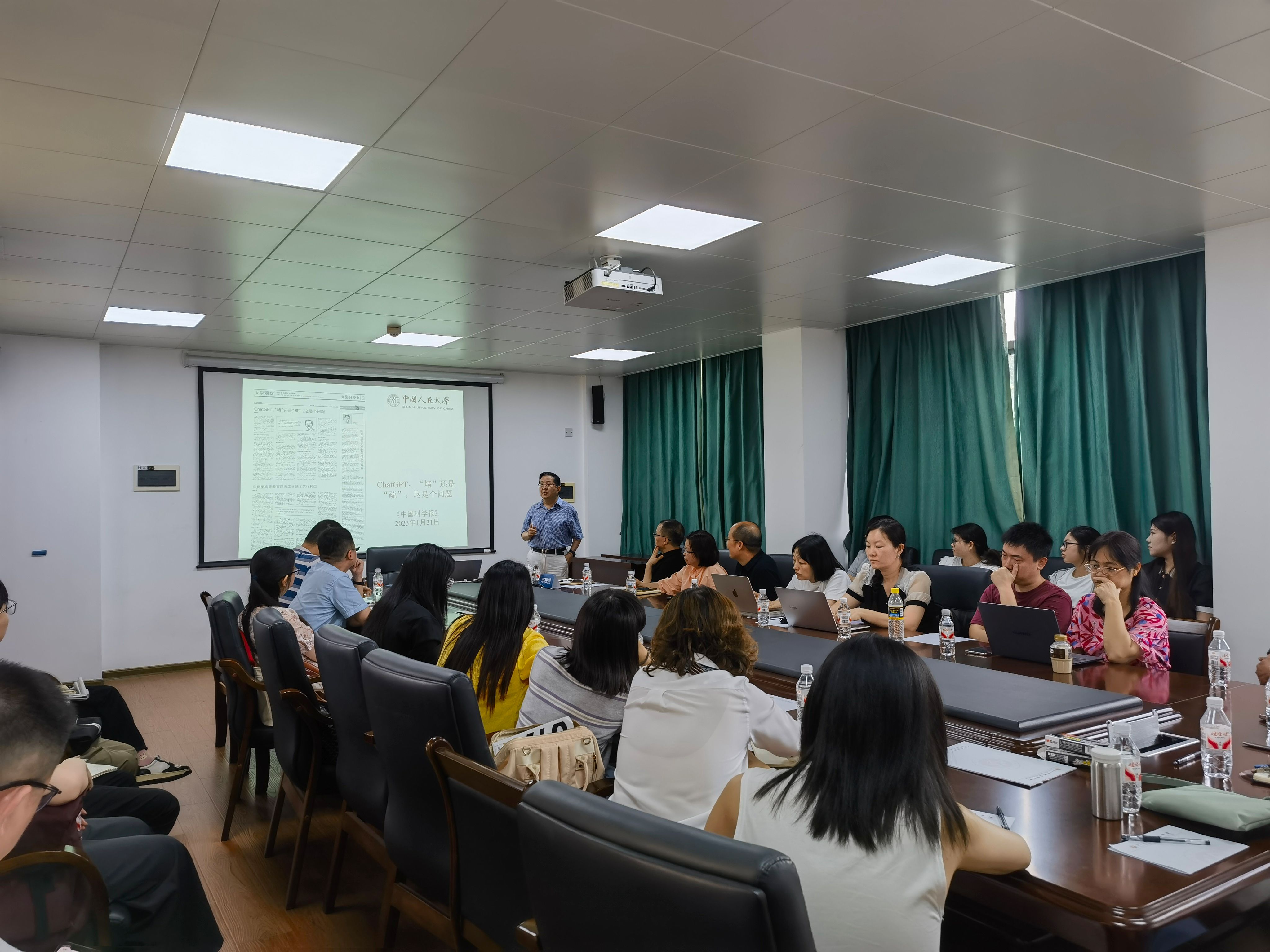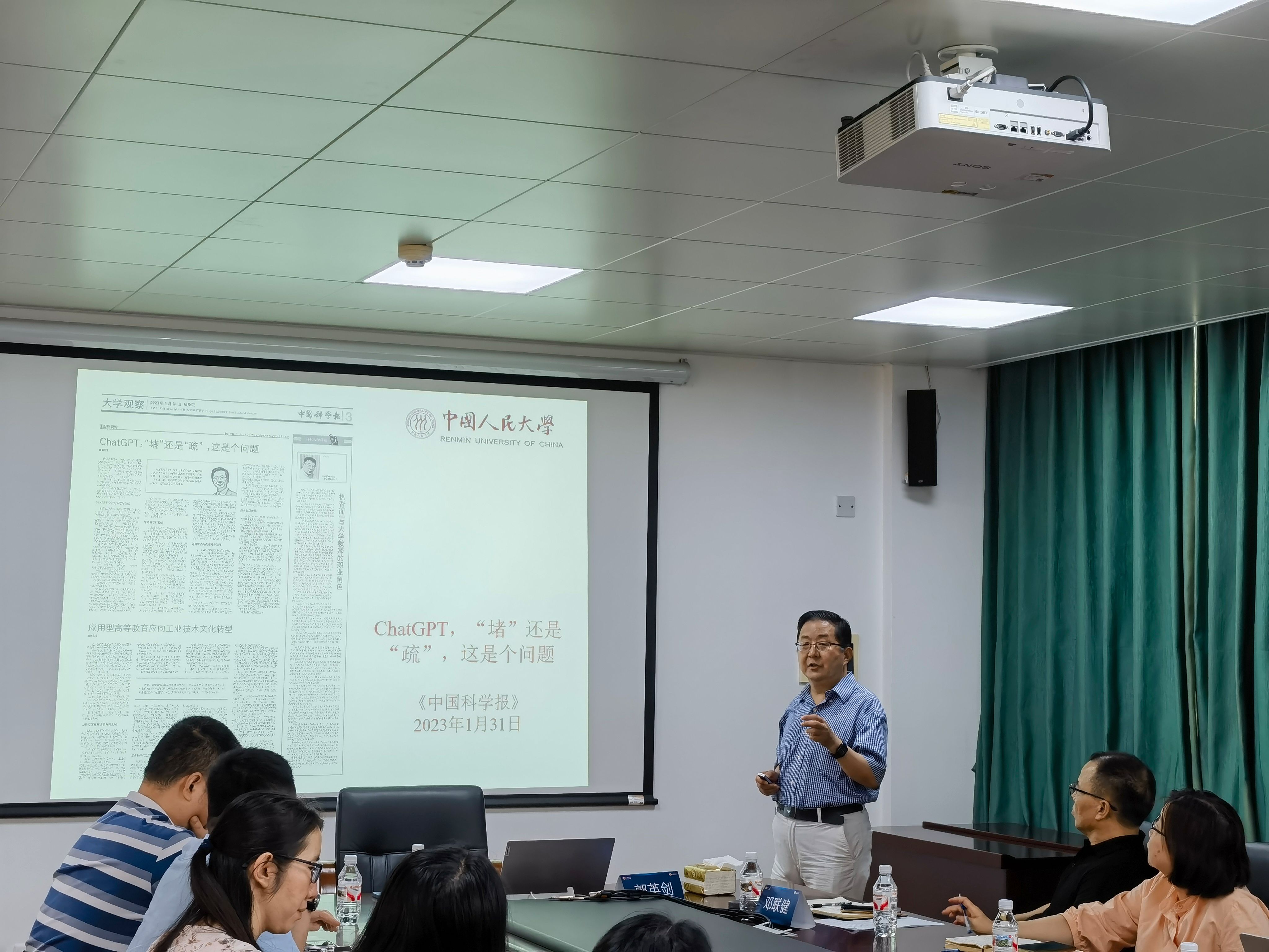 6月6日下午,“介子学术讲坛”第九十二讲在学院301会议室举行。中国人民大学郭英剑教授应邀做题为“人工智能时代的外语专业建设与未来发展”的讲座。邓联健教授主持,学院各系主任,骨干教师和学生代表30余人参加讲座。