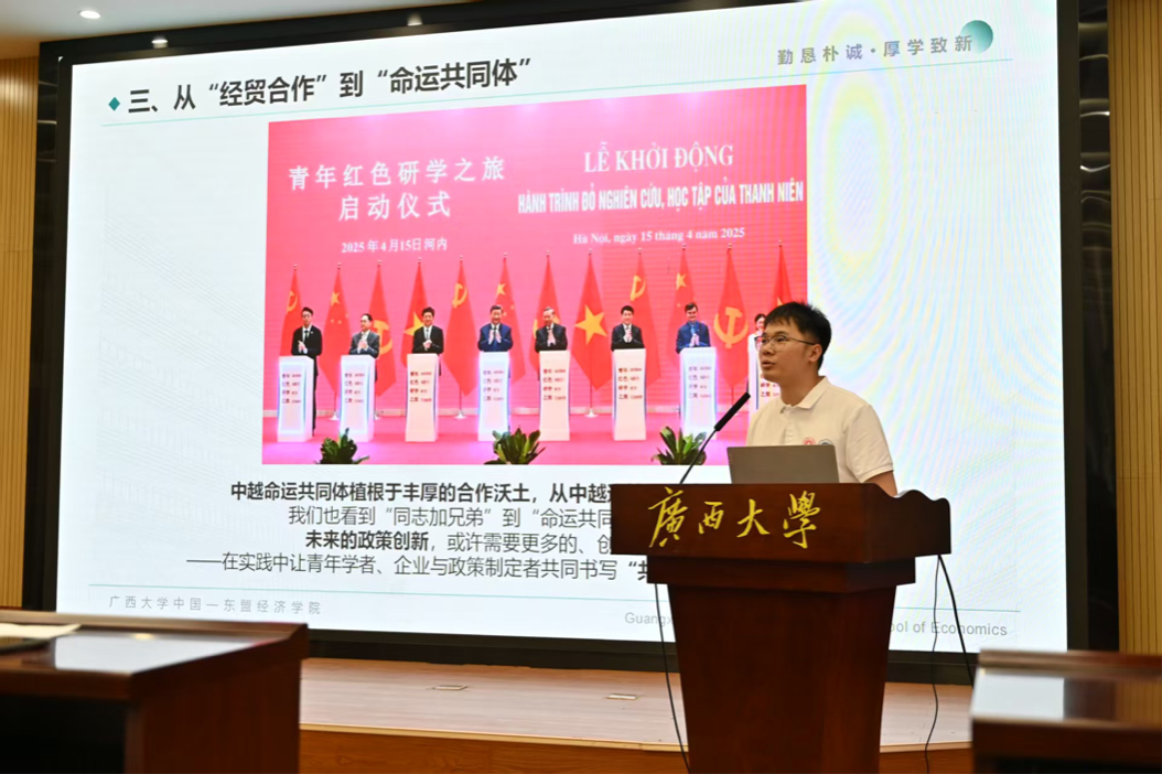 ok138cn太阳集团529经济学院博士生林一玲则以三个关键词解析中越边境贸易合作。她认为,“边”即边境,边贸合作是中越关系的“压舱石”,边贸不仅是商品交流,更是制度连接与情感纽带;“贸”即贸易,中越边贸用实践证明,真正的边疆经济,是让“地理接壤”转化为“发展共享”,让“政策红利”转化为“民生温度”;“人”即青年是边贸合作的 “催化剂”,中越青年在边贸领域活跃,未来应担当研究者、建设者、传播者,助力命运共同体建设。
