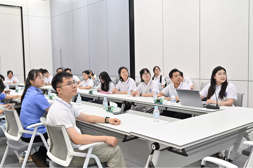 郭建林向实践团成员介绍了铁路港的基本情况,强调其作为中越班列重要节点及对越出口集散中心的地位。公司在物流区开发运营方面,经营态势良好,2024年营收6072万元、利润431万元,并重点推进光伏发电等绿色发展项目。