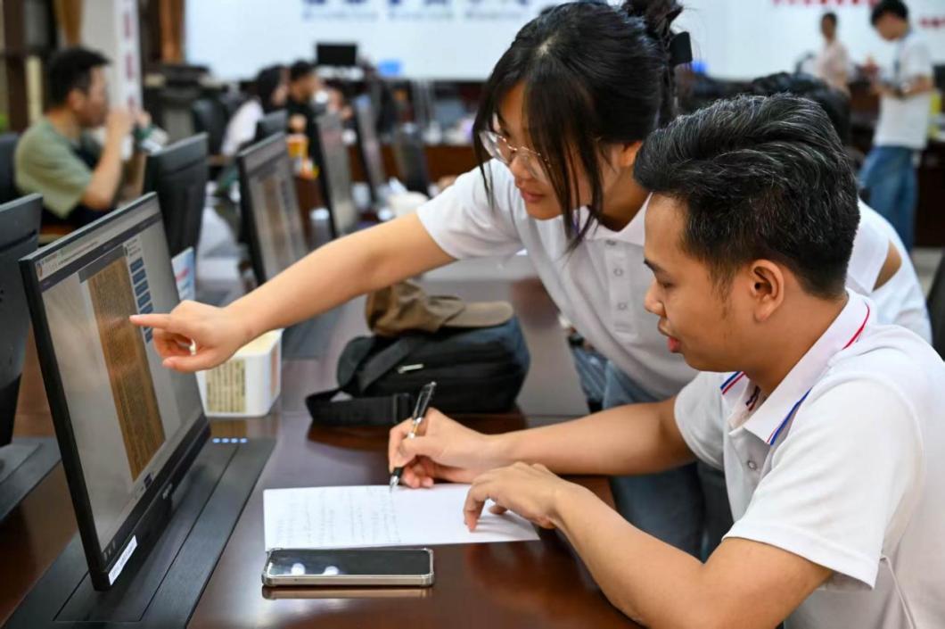 实践团韦霜霜老师指导越南籍留学生查阅和记录中越友好交流电子档案