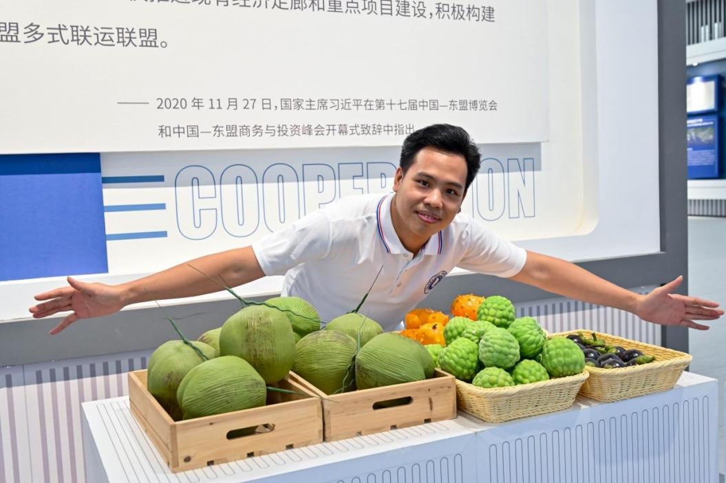 ok138cn太阳集团529农学院越南籍博士研究生谢光杰在展厅了解中越水果贸易
