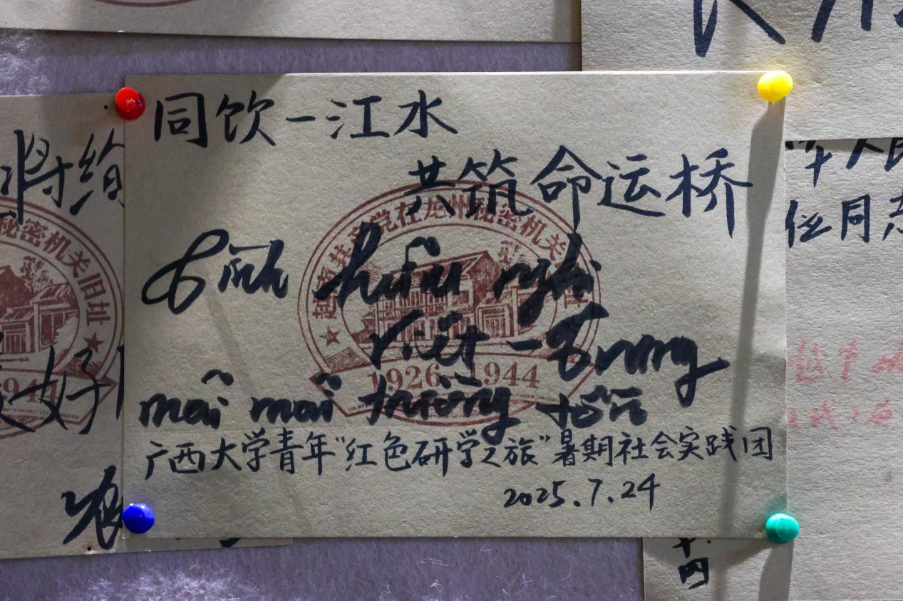 参观结束后,实践团成员驻足旧址一楼的留言墙旁,中越青年共同拿起笔,郑重地写下了对中越友谊的美好祝愿。一句句“中越友谊长存”“中越友谊万古长青”“讲好中越友谊故事”,以及两国青年用各自语言写下的祝福语,汇聚成了一幅充满希望和友情的画卷,表达了他们共同传承和发展中越传统友谊的坚定决心。